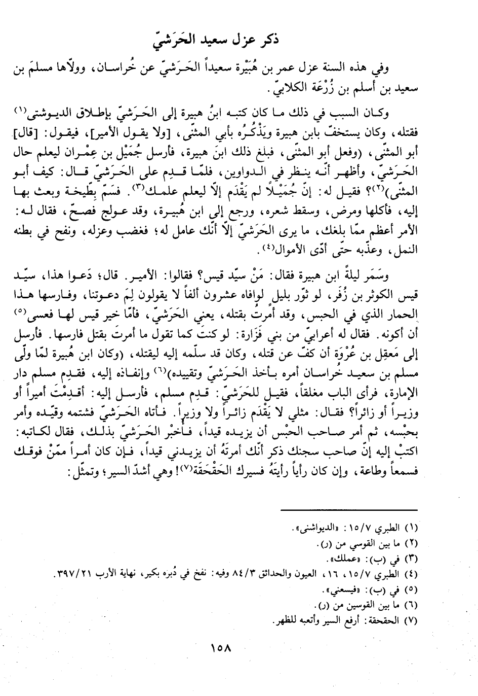 وَسَمَرَ لَيْلَةً ابْنُ هُبَيْرَةَ، فَقَالَ: مَنْ سَيِّدُ قَيْسٍ؟ فَقَالُوا: الْأَمِيرُ. قَالَ: دَعُوا هَذَا: سَيِّدُ قَيْسٍ: الْكَوْثَرُ بْنُ زُفَرَ، لَوْ ثَوَّرَ بِلَيْلٍ لَوَافَاهُ عِشْرُونَ أَلْفًا لَا يَقُولُونَ لِمَ دَعَوْتَنَا، وَفَارِسُهَا هَذَا الْحِمَارُ الَّذِي فِي الْحَبْسِ، وَقَدْ أَمَرْتُ بِقَتْلِهِ، يَعْنِي الْحَرَشِيَّ، فَأَمَّا خَيْرُ قَيْسٍ لَهَا فَعَسَى أَنْ أَكُونَهُ. فَقَالَ لَهُ أَعْرَابِيٌّ مِنْ بَنِي فَزَارَةَ: لَوْ كُنْتَ كَمَا تَقُولُ مَا أَمَرْتَ بِقَتْلِ فَارِسِهَا. فَأَرْسَلَ إِلَى مَعْقِلِ بْنِ عُرْوَةَ أَنْ كُفَّ عَنْ قَتْلِهِ، وَكَانَ قَدْ سَلَّمَهُ إِلَيْهِ لِيَقْتُلَهُ، (وَكَانَ ابْنُ هُبَيْرَةَ لَمَّا وَلَّى مُسْلِمَ بْنَ سَعِيدٍ خُرَاسَانَ أَمَرَهُ بِأَخْذِ الْحَرَشِيِّ وَتَقْيِيدِهِ) وَإِنْفَاذِهِ إِلَيْهِ، فَقَدِمَ مُسْلِمٌ دَارَ الْإِمَارَةِ، فَرَأَى الْبَابَ مُغْلَقًا، فَقِيلَ لِلْحَرَشِيِّ: قَدِمَ مُسْلِمٌ، فَأَرْسَلَ إِلَيْهِ: أَقَدِمْتَ أَمِيرًا أَوْ وَزِيرًا أَوْ زَائِرًا؟ فَقَالَ: مِثْلِي لَا يَقْدَمُ زَائِرًا وَلَا وَزِيرًا. فَأَتَاهُ الْحَرَشِيُّ فَشَتَمَهُ وَقَيَّدَهُ وَأَمَّرَ بِحَبْسِهِ، ثُمَّ أَمَرَ صَاحِبَ الْحَبْسِ أَنْ يَزِيدَهُ قَيْدًا، فَأُخْبِرَ الْحَرَشِيُّ بِذَلِكَ، فَقَالَ لِكَاتِبِهِ: اكْتُبْ إِلَيْهِ إِنَّ صَاحِبَ سِجْنِكَ ذَكَرَ أَنَّكَ أَمَرْتَهُ أَنْ يَزِيدَنِي قَيْدًا، فَإِنْ كَانَ أَمْرًا فَوْقَكَ فَسَمْعًا وَطَاعَةً، وَإِنْ كَانَ رَأْيًا رَأَيْتَهُ فَسَيْرُكَ الْحَقْحَقَةِ! وَهِيَ أَشَدُّ السِّيَرِ، وَتَمَثَّلَ: