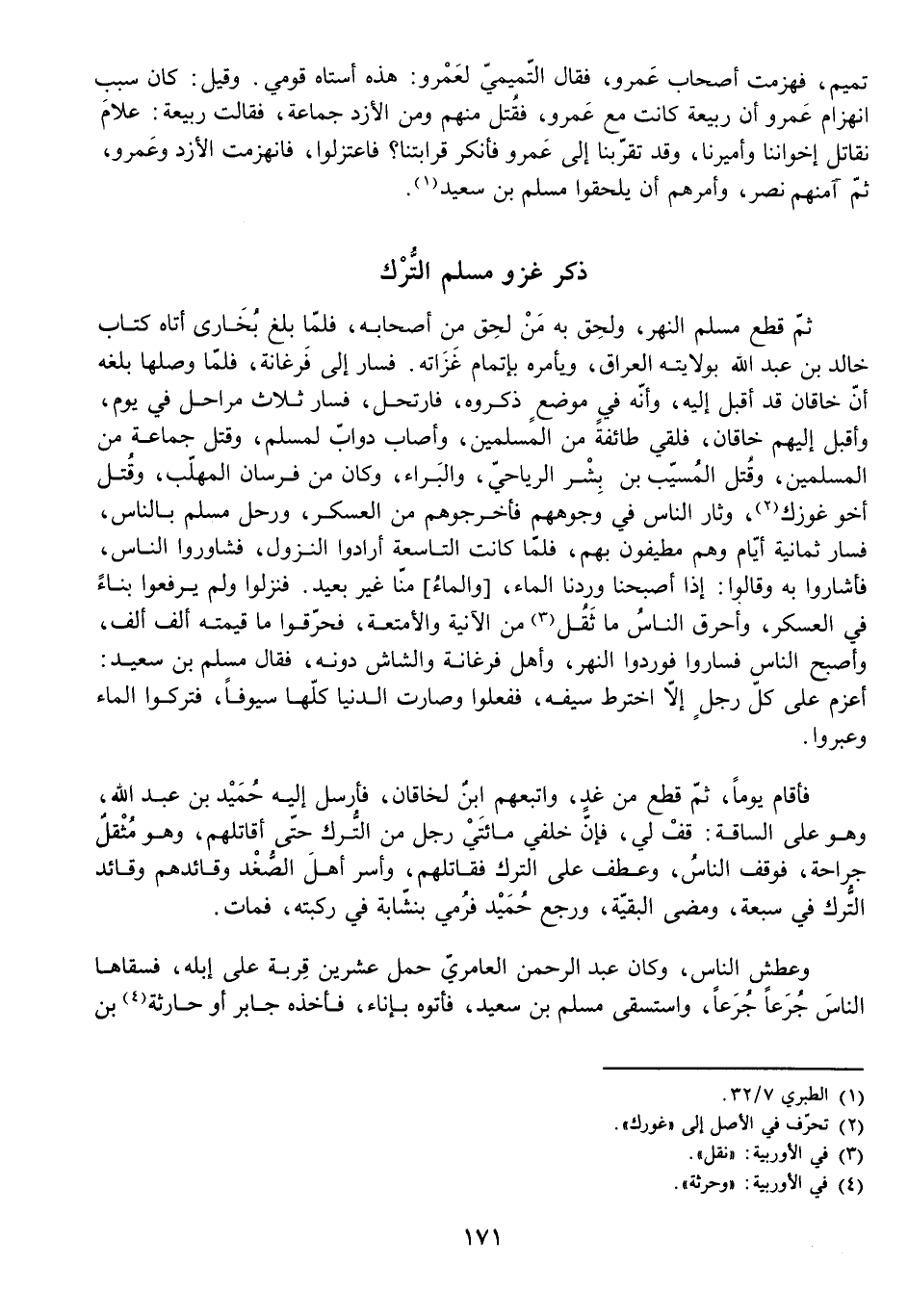 ثُمَّ قَطَعَ مُسْلِمٌ النَّهْرَ، وَلَحِقَ بِهِ مَنْ لَحِقَ مِنْ أَصْحَابِهِ، فَلَمَّا بَلَغَ بُخَارَى أَتَاهُ كِتَابُ خَالِدِ بْنِ عَبْدِ اللَّهِ بِوِلَايَتِهِ الْعِرَاقَ، وَيَأْمُرُهُ بِإِتْمَامِ غَزَاتِهِ. فَسَارَ إِلَى فَرْغَانَةَ، فَلَمَّا وَصَلَهَا بَلَغَهُ أَنَّ خَاقَانَ قَدْ أَقْبَلَ إِلَيْهِ، وَأَنَّهُ فِي مَوْضِعٍ ذَكَرُوهُ، فَارْتَحَلَ، فَسَارَ ثَلَاثَ مَرَاحِلَ فِي يَوْمٍ، وَأَقْبَلَ إِلَيْهِمْ خَاقَانُ، فَلَقِيَ طَائِفَةً مِنَ الْمُسْلِمِينَ وَأَصَابَ دَوَابَّ لِمُسْلِمٍ، وَقَتَلَ جَمَاعَةً مِنَ الْمُسْلِمِينَ، وَقُتِلَ الْمُسَيَّبُ بْنُ بِشْرٍ الرِّيَاحَيُّ، وَالْبَرَاءُ، وَكَانَ مِنْ فُرْسَانِ الْمُهَلَّبِ، وَقُتِلَ أَخُو غَوْزَكَ، وَثَارَ النَّاسُ فِي وُجُوهِهِمْ فَأَخْرَجُوهُمْ مِنَ الْعَسْكَرِ، وَرَحَلَ مُسْلِمٌ بِالنَّاسِ، فَسَارَ ثَمَانِيَةَ أَيَّامٍ وَهُمْ مُطِيفُونَ بِهِمْ، فَلَمَّا كَانَتِ التَّاسِعَةُ أَرَادُوا النُّزُولَ، فَشَاوَرُوا النَّاسَ، فَأَشَارَ بِهِ وَقَالُوا: إِذَا أَصْبَحْنَا وَرْدَنَا الْمَاءَ [وَالْمَاءُ] مِنَّا غَيْرُ بَعِيدٍ. فَنَزَلُوا وَلَمْ يَرْفَعُوا بِنَاءً فِي الْعَسْكَرِ، وَأَحْرَقَ النَّاسُ مَا ثَقُلَ مِنَ الْآنِيَةِ وَالْأَمْتِعَةِ، فَحَرَقُوا مَا قِيمَتُهُ أَلْفُ أَلْفٍ، وَأَصْبَحَ النَّاسُ، فَسَارُوا، فَوَرَدُوا النَّهْرَ، وَأَهْلُ فَرْغَانَةَ وَالشَّاشِ دُونَهُ، فَقَالَ مُسْلِمُ بْنُ سَعِيدٍ: أَعْزِمُ عَلَى كُلِّ رَجُلٍ إِلَّا اخْتَرَطَ سَيْفَهُ، فَفَعَلُوا وَصَارَتِ الدُّنْيَا كُلُّهَا سُيُوفًا، فَتَرَكُوا الْمَاءَ وَعَبَرُوا.
