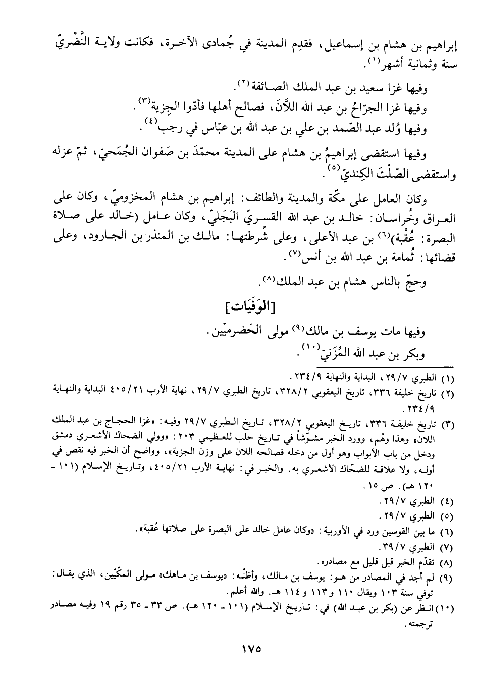 وَفِيهَا غَزَا سَعِيدُ بْنُ عَبْدِ الْمَلِكِ الصَّائِفَةَ. وَفِيهَا غَزَا الْجَرَّاحُ بْنُ عَبْدِ اللَّهِ اللَّانَ، فَصَالَحَ أَهْلَهَا فَأَدَّوُا الْجِزْيَةَ. وَفِيهَا وُلِدَ عَبْدُ الصَّمَدِ بْنُ عَلِيِّ بْنِ عَبْدِ اللَّهِ بْنِ عَبَّاسٍ فِي رَجَبٍ. وَفِيهَا اسْتَقْضَى إِبْرَاهِيمُ بْنُ هِشَامٍ عَلَى الْمَدِينَةِ مُحَمَّدَ بْنَ صَفْوَانَ الْجُمَحِيَّ، ثُمَّ عَزَلَهُ وَاسْتَقْضَى الصَّلْتَ الْكِنْدِيَّ.