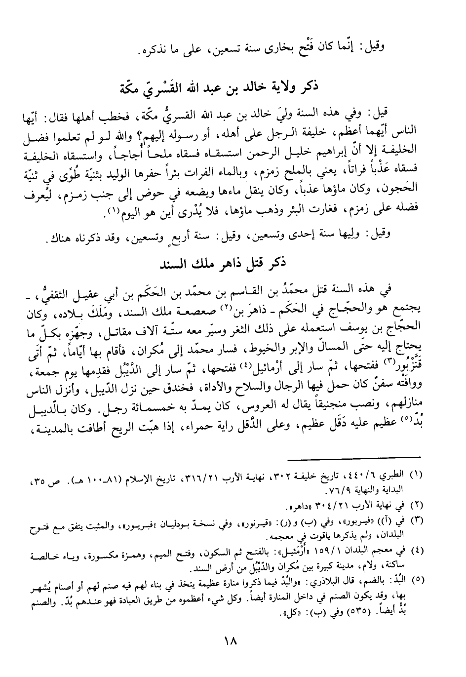 فِي هَذِهِ السَّنَةِ قَتَلَ مُحَمَّدُ بْنُ الْقَاسِمِ بْنِ مُحَمَّدِ بْنِ الْحَكَمِ بْنِ أَبِي عُقَيْلٍ الثَّقَفِيِّ، - يَجْتَمِعُ هُوَ وَالْحَجَّاجُ فِي الْحَكَمِ -، ذَاهِرَ بْنَ صَعْصَعَةَ مَلِكَ السِّنْدِ، وَمَلَكَ بِلَادَهُ، وَكَانَ الْحَجَّاجُ بْنُ يُوسُفَ اسْتَعْمَلَهُ عَلَى ذَلِكَ الثَّغْرِ وَسَيَّرَ مَعَهُ سِتَّةَ أَلَافِ مُقَاتِلٍ، وَجَهَّزَهُ بِكُلِّ مَا يَحْتَاجُ إِلَيْهِ حَتَّى الْمَسَالِّ وَالْإِبَرِ وَالْخُيُوطِ، فَسَارَ مُحَمَّدُ إِلَى مُكْرَانَ فَأَقَامَ بِهَا أَيَّامًا، ثُمَّ أَتَى قَنَّزْبُورَ فَفَتَحَهَا، ثُمَّ سَارَ إِلَى أَرْمَائِيلَ فَفَتَحَهَا، ثُمَّ سَارَ إِلَى الدَّيْبُلِ، فَقَدِمَهَا يَوْمَ جُمُعَةٍ، وَوَافَتْهُ سُفُنٌ كَانَ حَمَلَ فِيهَا الرِّجَالَ وَالسِّلَاحَ وَالْأَدَاةَ، فَخَنْدَقَ حِينَ نَزَلَ الدَّيْبُلَ، وَأَنْزَلَ النَّاسَ مَنَازِلَهُمْ، وَنَصَبَ مَنْجَنِيقًا يُقَالُ لَهُ الْعَرُوسُ، كَانَ يَمُدُّ بِهِ خَمْسُمِائَةِ رَجُلٍ، وَكَانَ بِالدَّيْبُلِ بُدٌّ عَظِيمٌ عَلَيْهِ دَقَلٌ عَظِيمٌ، وَعَلَى الدَّقَلِ رَايَةٌ حَمْرَاءُ، إِذَا هَبَّتِ الرِّيحُ أَطَافَتْ بِالْمَدِينَةِ،