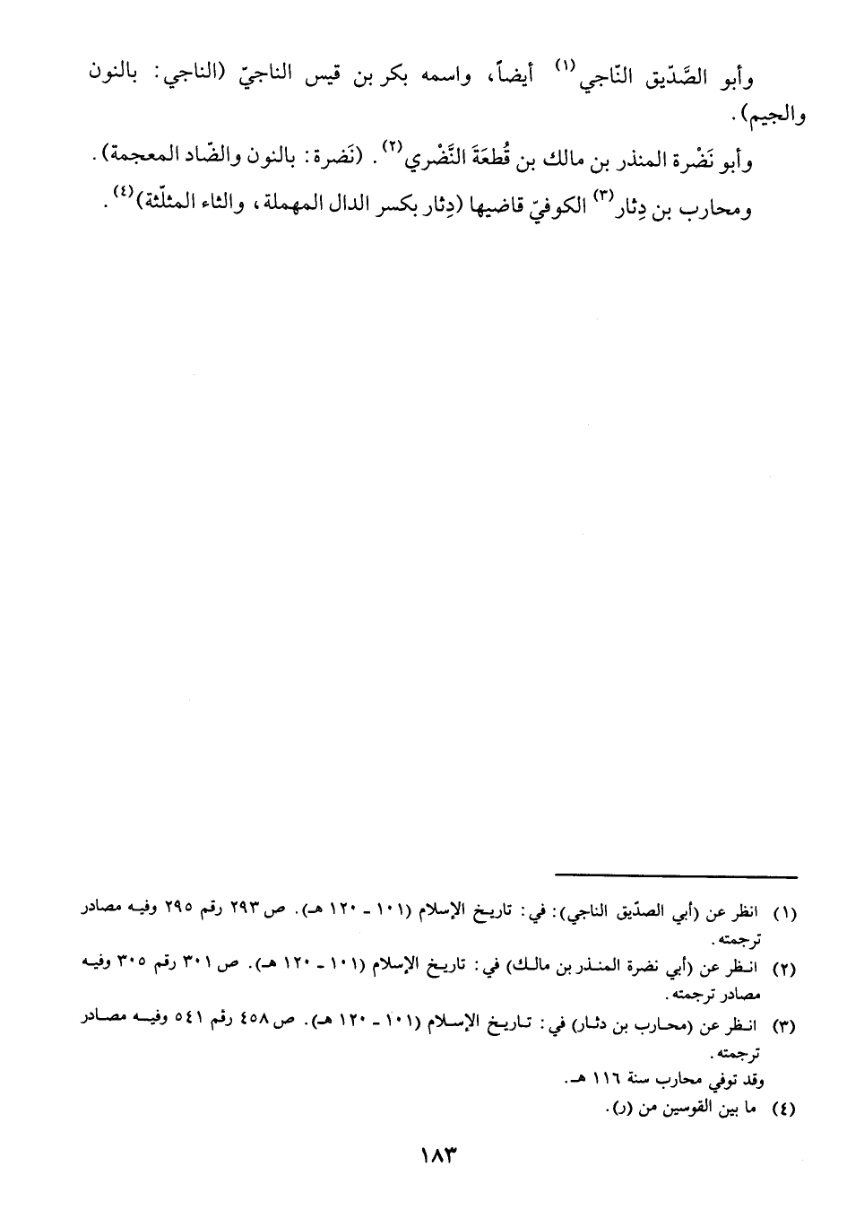 وَأَبُو الصِّدِّيقِ النَّاجِيُّ أَيْضًا، وَاسْمُهُ بَكْرُ بْنُ قَيْسٍ النَّاجِيُّ، (النَّاجِيُّ: بِالنُّونِ وَالْجِيمِ) . وَأَبُو نَضْرَةَ الْمُنْذِرُ بْنُ مَالِكِ بْنِ قُطْعَةَ النَّضْرِيُّ، (نَضْرَةُ: بِالنُّونِ وَالضَّادِ الْمُعْجَمَةِ) . وَمُحَارِبُ بْنُ دِثَارٍ الْكُوفِيُّ قَاضِيهَا، (دِثَارٌ بِكَسْرِ الدَّالِ الْمُهْمَلَةِ، وَالثَّاءِ الْمُثَلَّثَةِ) .