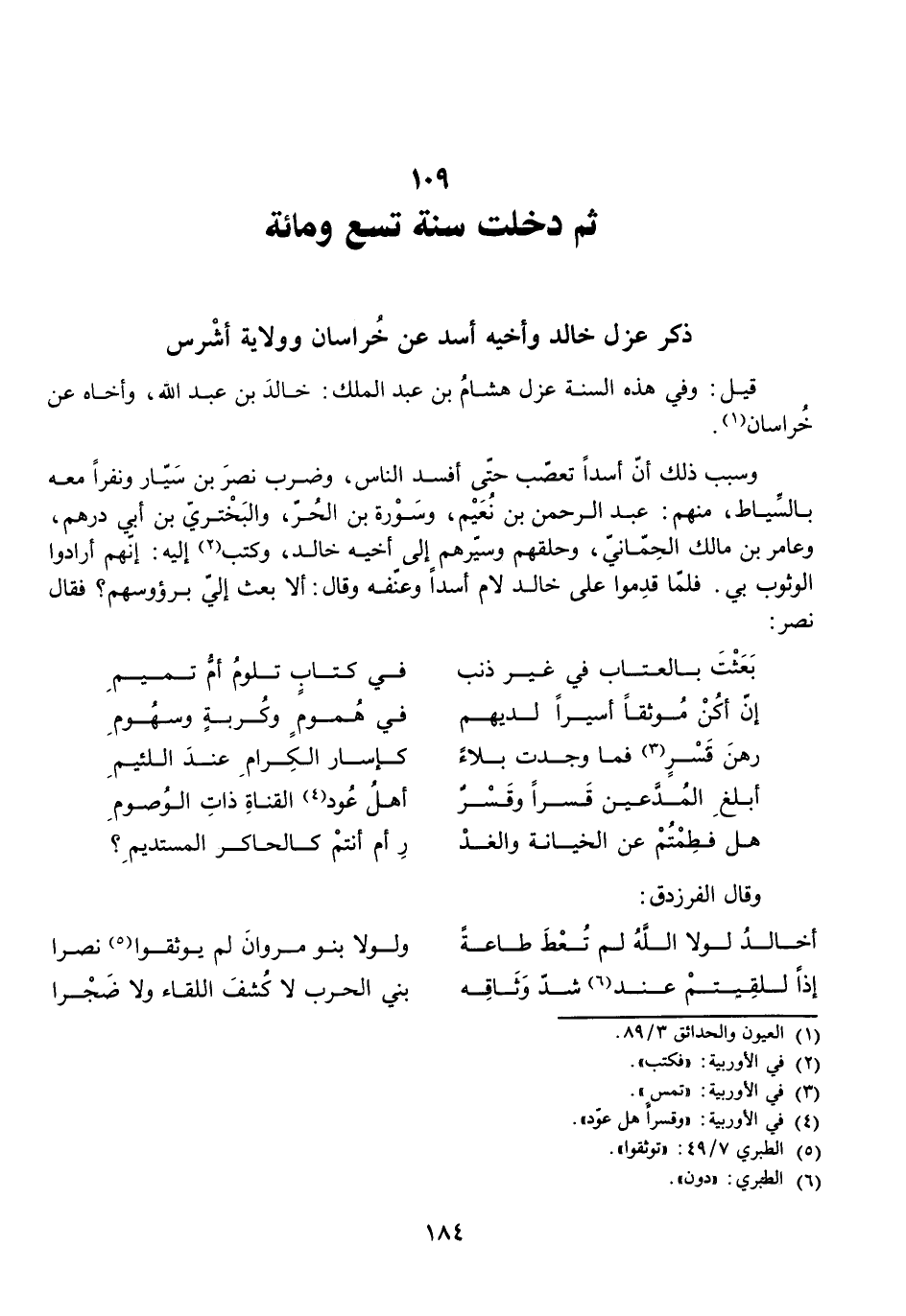 أَخَالِدُ لَوْلَا اللَّهُ لَمْ تُعْطَ طَاعَةً ... وَلَوْلَا بَنُو مَرْوَانَ لَمْ يُوثِقُوا نَصْرَا