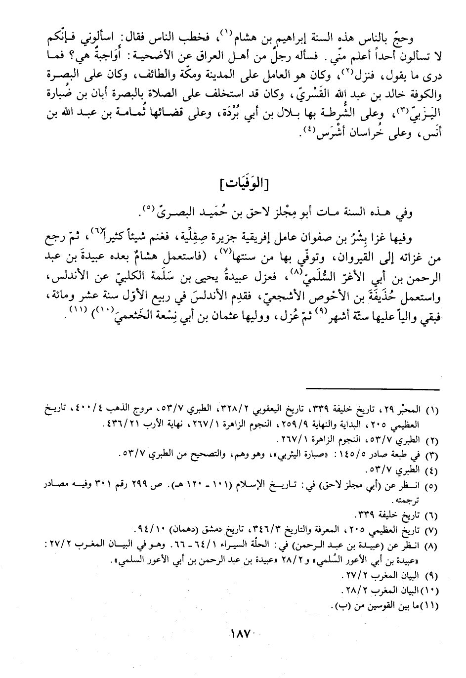 وَفِي هَذِهِ السَّنَةِ مَاتَ أَبُو مِجْلَزٍ لَاحِقُ بْنُ حُمَيْدٍ الْبَصْرِيُّ، وَفِيهَا غَزَا بِشْرُ بْنُ صَفْوَانَ عَامِلُ إِفْرِيقِيَّةَ جَزِيرَةَ صِقِلِّيَةَ، فَغَنِمَ شَيْئًا كَثِيرًا ثُمَّ رَجَعَ مِنْ غَزَاتِهِ إِلَى الْقَيْرَوَانِ وَتُوُفِّيَ بِهَا مِنْ سَنَتِهَا، (فَاسْتَعْمَلَ هِشَامٌ بَعْدَهُ عُبَيْدَةَ بْنَ عَبْدِ الرَّحْمَنِ بْنِ أَبِي الْأَغَرِّ السُّلَمِيَّ، فَعَزَلَ عُبَيْدَةُ يَحْيَى بْنَ سَلَمَةَ الْكَلْبِيَّ عَنِ الْأَنْدَلُسِ، وَاسْتَعْمَلَ حُذَيْفَةَ بْنَ الْأَحْوَصِ الْأَشْجَعِيَّ، فَقَدِمَ الْأَنْدَلُسَ فِي رَبِيعٍ الْأَوَّلِ سَنَةَ عَشْرٍ وَمِائَةٍ، فَبَقِيَ وَالِيًا عَلَيْهَا سِتَّةَ أَشْهُرٍ ثُمَّ عُزِلَ، وَوَلِيَهَا عُثْمَانُ بْنُ أَبِي نِسْعَةَ الْخَثْعَمِيُّ.