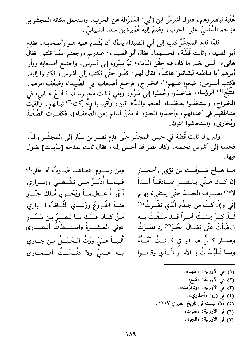وَلَمْ يَزَلْ ثَابِتُ قُطْنَةَ فِي حَبْسِ الْمُجَشِّرِ حَتَّى قَدِمَ نَصْرُ بْنُ سَيَّارٍ إِلَى الْمُجَشِّرِ وَالِيًا، فَحَمَلَهُ إِلَى أَشْرَسَ فَحَبَسَهُ، وَكَانَ نَصْرٌ قَدْ أَحْسَنَ إِلَيْهِ، فَقَالَ ثَابِتٌ يَمْدَحْهُ [بِأَبْيَاتٍ] يَقُولُ فِيهَا: