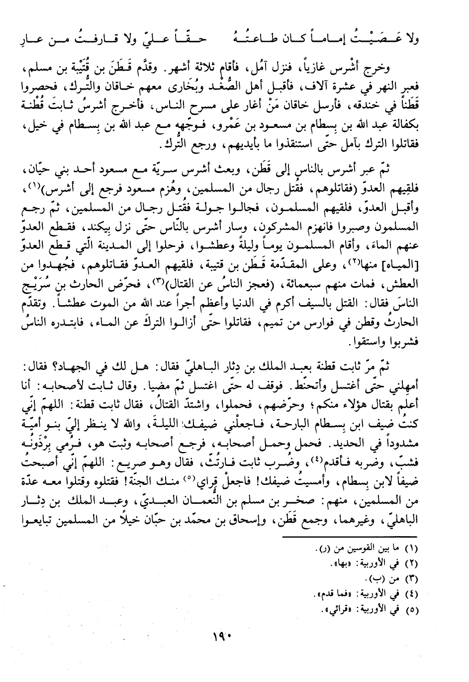 ثُمَّ مَرَّ ثَابِتُ قُطْنَةَ بِعَبْدِ الْمَلِكِ بْنِ دِثَارٍ الْبَاهِلِيِّ، فَقَالَ: هَلْ لَكَ فِي الْجِهَادِ؟ فَقَالَ: أَمْهِلْنِي حَتَّى أَغْتَسِلَ وَأَتَحَنَّطَ. فَوَقَفَ لَهُ حَتَّى اغْتَسَلَ ثُمَّ مَضَيَا، وَقَالَ ثَابِتٌ لِأَصْحَابِهِ: أَنَا أَعْلَمُ بِقِتَالِ هَؤُلَاءِ مِنْكُمْ، وَحَرَّضَهُمْ، فَحَمَلُوا، وَاشْتَدَّ الْقِتَالُ، فَقَالَ ثَابِتُ قُطْنَةَ: اللَّهُمَّ إِنِّي كَنْتُ ضَيْفَ ابْنِ بِسْطَامٍ الْبَارِحَةَ، فَاجْعَلْنِي ضَيْفَكَ اللَّيْلَةَ، وَاللَّهِ لَا يَنْظُرُ إِلَيَّ بَنُو أُمَيَّةَ مَشْدُودًا فِي الْحَدِيدِ. فَحَمَلَ وَحَمَلَ أَصْحَابُهُ، فَرَجَعَ أَصْحَابُهُ وَثَبَتَ هُوَ، فَرُمِيَ بِرْذَوْنُهُ فَشَبَّ، وَضَرَبَهُ فَأَقْدَمَ، وَضُرِبَ ثَابِتٌ، فَارْتُثَّ، فَقَالَ وَهُوَ صَرِيعٌ: اللَّهُمَّ إِنِّي أَصْبَحْتُ ضَيْفًا لِابْنِ بِسْطَامٍ وَأَمْسَيْتُ ضَيْفَكَ! فَاجْعَلْ قِرَايَ مِنْكَ الْجَنَّةَ! فَقَتَلُوهُ وَقَتَلُوا مَعَهُ عِدَّةً مِنَ الْمُسْلِمِينَ، مِنْهُمْ: صَخْرُ بْنُ مُسْلِمِ بْنِ النُّعْمَانِ الْعَبْدِيُّ، وَعَبْدُ الْمَلِكِ بْنُ دِثَارٍ الْبَاهِلِيُّ، وَغَيْرُهُمَا، وَجَمَعَ قَطَنٌ، وَإِسْحَاقُ بْنُ مُحَمَّدِ بْنِ حِبَّانَ خَيْلًا مِنَ الْمُسْلِمِينَ تَبَايَعُوا