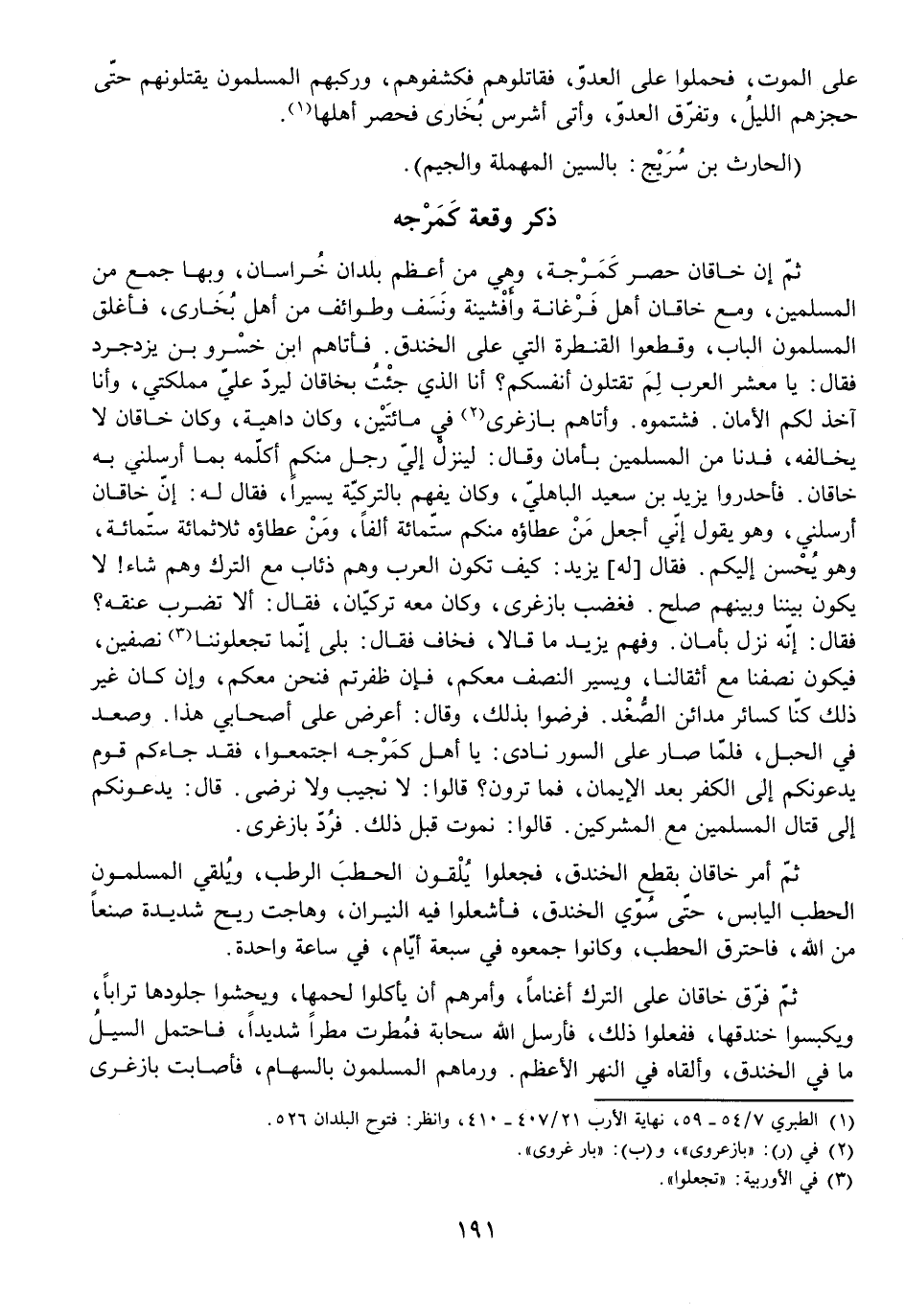 ثُمَّ إِنَّ خَاقَانَ حَصَرَ كَمَرْجَهْ، وَهِيَ مِنْ أَعْظَمِ بُلْدَانِ خُرَاسَانَ، وَبِهَا جَمْعٌ مِنَ الْمُسْلِمِينَ، وَمَعَ خَاقَانَ أَهْلُ فَرْغَانَةَ وَأَفْشِينَةَ وَنَسَفَ وَطَوَائِفُ مِنْ أَهْلِ بُخَارَى، فَأَغْلَقَ الْمُسْلِمُونَ الْبَابَ، وَقَطَعُوا الْقَنْطَرَةَ الَّتِي عَلَى الْخَنْدَقِ. فَأَتَاهُمُ ابْنُ خِسْرُو بْنِ يَزْدِجَرْدَ، فَقَالَ: يَا مَعْشَرَ الْعَرَبِ لِمَ تَقْتُلُونَ أَنْفُسَكُمْ؟ أَنَا الَّذِي جِئْتُ بِخَاقَانَ لِيَرُدَّ عَلَيَّ مَمْلَكَتِي، وَأَنَا آخِذٌ لَكُمُ الْأَمَانَ. فَشَتَمُوهُ. وَأَتَاهُمْ بَازَغْرَى فِي مِائَتَيْنِ، وَكَانَ دَاهِيَةً، وَكَانَ خَاقَانُ لَا يُخَالِفُهُ، فَدَنَا مِنَ الْمُسْلِمِينَ بِأَمَانٍ، وَقَالَ: لِيَنْزِلَ إِلَيَّ رَجُلٌ مِنْكُمْ أُكَلِّمُهُ بِمَا أَرْسَلَنِي بِهِ خَاقَانُ. فَأَحْدَرُوا يَزِيدَ بْنَ سَعِيدٍ الْبَاهِلِيَّ، وَكَانَ يَفْهَمُ بِالتُّرْكِيَّةِ يَسِيرًا، فَقَالَ لَهُ: إِنَّ خَاقَانَ أَرْسَلَنِي، وَهُوَ يَقُولُ إِنِّي أَجْعَلُ مَنْ عَطَاؤُهُ مِنْكُمْ سِتُّمِائَةٍ أَلْفًا، وَمِنْ عَطَاؤُهُ ثَلَاثُمِائَةٍ سِتَّمِائَةٍ، وَهُوَ يُحْسِنُ إِلَيْكُمْ. فَقَالَ [لَهُ] يَزِيدُ: كَيْفَ تَكُونُ الْعَرَبُ وَهُمْ ذِئَابٌ مَعَ التُّرْكِ وَهُمْ شَاءٌ! لَا يَكُونُ بَيْنَنَا وَبَيْنَهُمْ صُلْحٌ. فَغَضِبَ بَازَغْرَى، وَكَانَ مَعَهُ تُرْكِيَّانِ، فَقَالَا: أَلَا تَضْرِبُ عُنُقَهُ؟ فَقَالَ: إِنَّهُ نَزَلَ بِأَمَانٍ. وَفَهِمَ يَزِيدُ مَا قَالَا، فَخَافَ، فَقَالَ: بَلَى إِنَّمَا تَجْعَلُونَنَا نِصْفَيْنِ، فَيَكُونُ نَصْفُنَا مَعَ أَثْقَالِنَا، وَيَسِيرُ النِّصْفُ مَعَكُمْ، فَإِنْ ظَفِرْتُمْ فَنَحْنُ مَعَكُمْ، وَإِنْ كَانَ غَيْرُ ذَلِكَ كُنَّا كَسَائِرِ مَدَائِنِ الصُّغْدِ. فَرَضُوا بِذَلِكَ، وَقَالَ: أَعْرِضُ عَلَى أَصْحَابِي هَذَا. وَصَعِدَ فِي الْحَبْلِ، فَلَمَّا صَارَ عَلَى السُّورِ نَادَى: يَا أَهْلَ كَمْرَجَهْ، اجْتَمِعُوا، فَقَدْ جَاءَكُمْ قَوْمٌ يَدْعُونَكُمْ إِلَى الْكُفْرِ بَعْدَ الْإِيمَانِ، فَمَا تَرَوْنَ؟ قَالُوا: لَا نُجِيبُ وَلَا نَرْضَى. قَالَ: يَدْعُونَكُمْ إِلَى قِتَالِ الْمُسْلِمِينَ مَعَ الْمُشْرِكِينَ. قَالُوا: نَمُوتُ قَبْلَ ذَلِكَ. فَرُدَّ بَازَغْرَى.