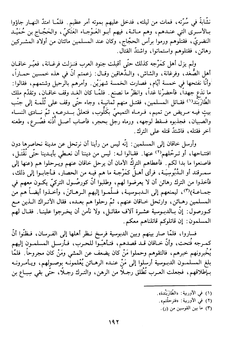 وَلَمْ يَزَلْ أَهْلُ كَمَرْجَهْ كَذَلِكَ حَتَّى أَقْبَلَتْ جُنُودُ الْعَرَبِ فَنَزَلَتْ فَرْغَانَةَ، فَعَيَّرَ خَاقَانُ أَهْلَ الصُّغْدِ، وَفَرْغَانَةَ، وَالشَّاشِ، وَالدَّهَاقِينَ، وَقَالَ: زَعَمْتُمْ أَنَّ فِي هَذِهِ خَمْسِينَ حِمَارًا، وَأَنَّا نَفْتَحُهَا فِي خَمْسَةِ أَيَّامٍ، فَصَارَتِ الْخَمْسَةُ شَهْرَيْنِ. وَأَمَرَهُمْ بِالرَّحِيلِ وَشَتَمَهُمْ، فَقَالُوا: مَا نَدَعُ جُهْدًا، فَأَحْضِرْنَا غَدًا، وَانْظُرْ مَا نَصْنَعُ. فَلَمَّا كَانَ الْغَدُ وَقَفَ خَاقَانُ، وَتَقَدَّمَ الطَّارْبَنْدُ، فَقَاتَلَ الْمُسْلِمِينَ، فَقَتَلَ مِنْهُمْ ثَمَانِيَةً، وَجَاءَ حَتَّى وَقَفَ عَلَى ثُلْمَةٍ إِلَى جَنْبِ بَيْتٍ فِيهِ مَرِيضٌ مِنْ تَمِيمٍ، فَرَمَاهُ التَّمِيمِيُّ بِكَلُّوبٍ، فَتَعَلَّقَ بِدِرْعِهِ، ثُمَّ نَادَى النِّسَاءَ وَالصِّبْيَانَ، فَجَذَبُوهُ فَسَقَطَ لِوَجْهِهِ، وَرَمَاهُ رَجُلٌ بِحَجَرٍ، فَأَصَابَ أَصْلَ أُذُنِهِ، فَصُرِعَ، وَطَعَنَهُ آخَرُ، فَقَتَلَهُ، فَاشْتَدَّ قَتْلُهُ عَلَى التُّرْكِ.