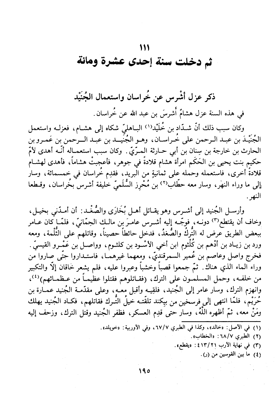 ذِكْرُ عَزْلِ أَشْرَسَ عَنْ خُرَاسَانَ وَاسْتِعْمَالِ الْجُنَيْدِ