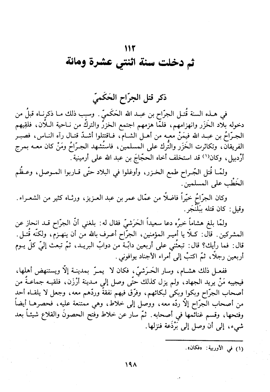 فِي هَذِهِ السَّنَةِ قُتِلَ الْجَرَّاحُ بْنُ عَبْدِ اللَّهِ الْحَكَمِيُّ. وَسَبَبُ ذَلِكَ مَا ذَكَرْنَاهُ قَبْلُ مِنْ دُخُولِهِ بِلَادَ الْخَزَرِ وَانْهِزَامِهِمْ، فَلَمَّا هَزَمَهُمُ اجْتَمَعَ الْخَزَرُ وَالتُّرْكُ مِنْ نَاحِيَةِ اللَّانِ، فَلَقِيَهُمُ الْجَرَّاحُ بْنُ عَبْدِ اللَّهِ فِيمَنْ مَعَهُ مِنْ أَهْلِ الشَّامِ، فَاقْتَتَلُوا أَشَدَّ قِتَالٍ رَآهُ النَّاسُ، فَصَبَرَ الْفَرِيقَانِ، وَتَكَاثَرَتِ الْخَزَرُ وَالتُّرْكُ عَلَى الْمُسْلِمِينَ، فَاسْتُشْهِدَ الْجَرَّاحُ وَمَنْ كَانَ مَعَهُ بِمَرْجِ أَرْدَبِيلَ، وَكَانَ قَدِ اسْتَخْلَفَ أَخَاهُ الْحَجَّاجَ بْنَ عَبْدِ اللَّهِ عَلَى إِرْمِينِيَّةَ.