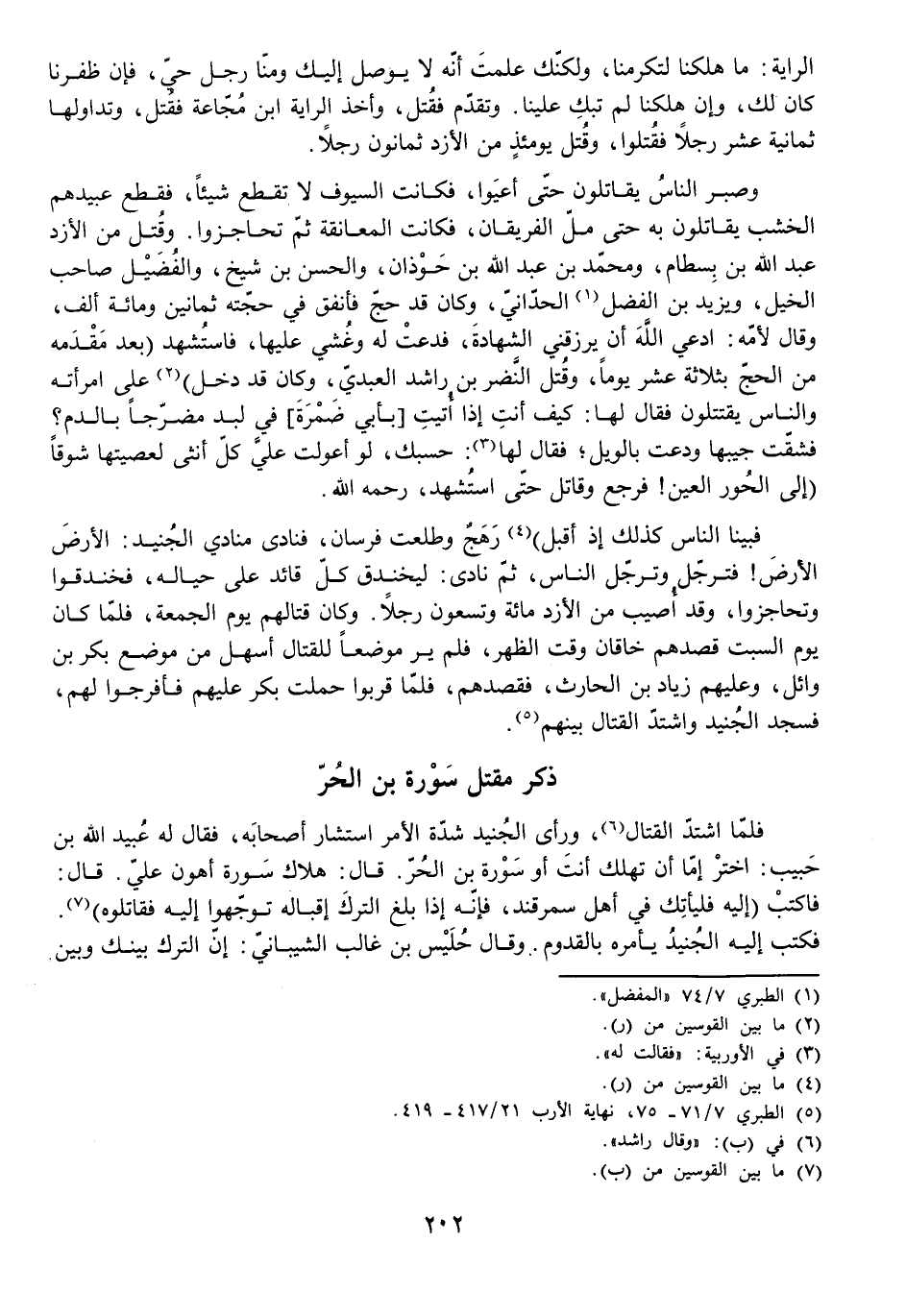 وَقُتِلَ مِنَ الْأَزْدِ عَبْدُ اللَّهِ بْنُ بِسْطَامٍ، وَمُحَمَّدُ بْنُ عَبْدِ اللَّهِ بْنِ حَوْذَانَ، وَالْحَسَنُ بْنُ شَيْخٍ، وَالْفُضَيْلُ صَاحِبُ الْخَيْلِ، وَيَزِيدُ بْنُ الْفَضْلِ الْحِدَّانِيُّ، وَكَانَ قَدْ حَجَّ فَأَنْفَقَ فِي حَجَّتِهِ ثَمَانِينَ وَمِائَةَ أَلْفٍ، وَقَالَ لِأُمِّهِ: ادْعِي اللَّهَ أَنْ يَرْزُقَنِي الشَّهَادَةَ، فَدَعَتْ لَهُ وَغُشِيَ عَلَيْهَا، فَاسْتُشْهِدَ بَعْدَ مَقْدِمِهِ مِنَ الْحَجِّ بِثَلَاثَةَ عَشَرَ يَوْمًا، وَقُتِلَ النَّضْرُ بْنُ رَاشِدٍ الْعَبْدِيُّ، وَكَانَ قَدْ دَخَلَ عَلَى امْرَأَتِهِ وَالنَّاسُ يَقْتَتِلُونَ فَقَالَ لَهَا: كَيْفَ أَنْتِ إِذَا أُتِيتِ بِأَبِي ضَمْرَةَ فِي لِبْدٍ مُضَرَّجًا بِالدَّمِ؟ فَشَقَّتْ جَيْبَهَا وَدَعَتْ بِالْوَيْلِ، فَقَالَ لَهَا: حَسْبُكِ، لَوْ أَعْوَلَتْ عَلَيَّ كُلُّ أُنْثَى لَعَصَيْتُهَا شَوْقًا إِلَى (الْحُورِ الْعِينِ! فَرَجَعَ وَقَاتَلَ حَتَّى اسْتُشْهِدَ، رَحِمَهُ اللَّهُ.