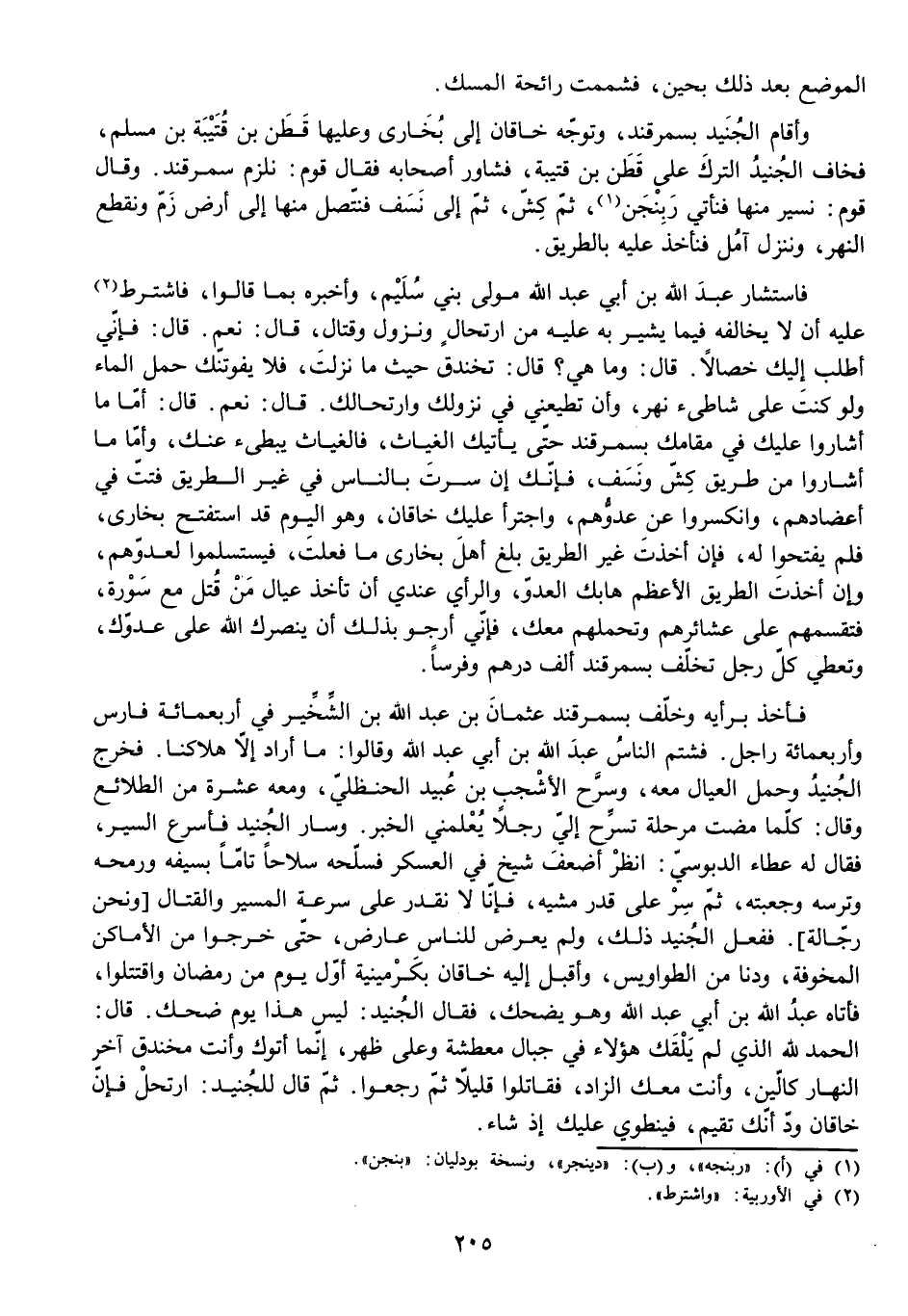 وَأَقَامَ الْجُنَيْدُ بِسَمَرْقَنْدَ، وَتَوَجَّهُ الْخَاقَانُ إِلَى بُخَارَى وَعَلَيْهَا قَطَنُ بْنُ قُتَيْبَةَ بْنِ مُسْلِمٍ، فَخَافَ الْجُنَيْدُ التُّرْكَ عَلَى قَطَنِ بْنِ قُتَيْبَةَ، فَشَاوَرَ أَصْحَابَهُ فَقَالَ قَوْمٌ: نَلْزَمُ سَمَرْقَنْدَ. وَقَالَ قَوْمٌ: نَسِيرُ مِنْهَا فَنَأْتِي رَبِنْجَنَ، ثُمَّ كَشَّ، ثُمَّ إِلَى نَسَفَ، فَنَتَّصِلُ مِنْهَا إِلَى أَرْضِ زُمَّ، وَنَقْطَعُ النَّهْرَ وَنَنْزِلُ آمُلَ فَنَأْخُذُ عَلَيْهِ بِالطَّرِيقِ.
