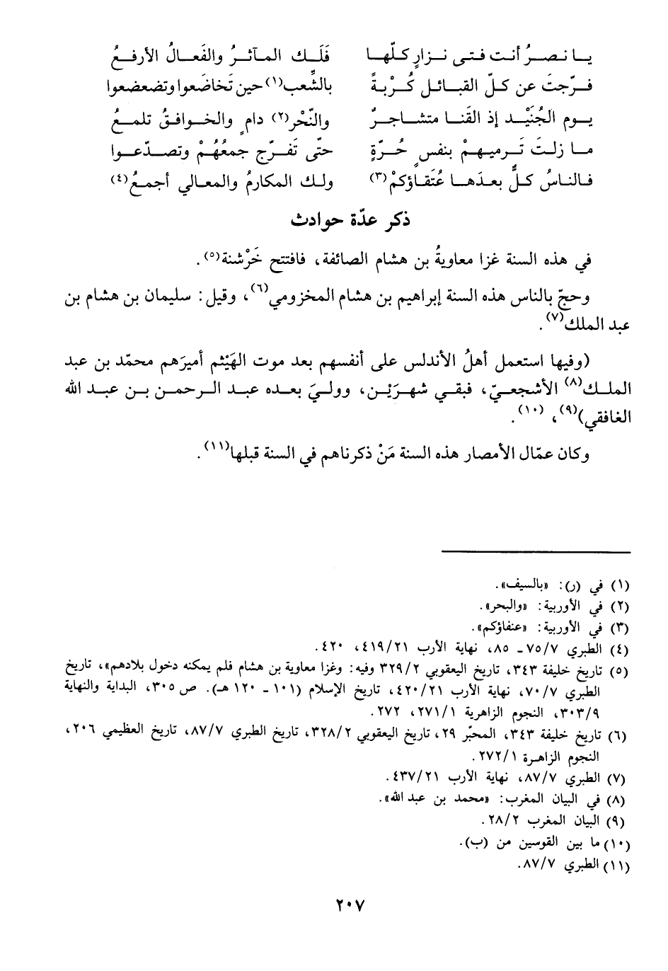 (وَفِيهَا اسْتَعْمَلَ أَهْلُ الْأَنْدَلُسِ عَلَى أَنْفُسِهِمْ بَعْدَ مَوْتِ الْهَيْثَمِ أَمِيرَهُمْ مُحَمَّدَ بْنَ عَبْدِ الْمَلِكِ الْأَشْجَعِيَّ، فَبَقِيَ شَهْرَيْنِ، وَوَلِيَ بَعْدَهُ عَبْدُ الرَّحْمَنِ بْنُ عَبْدِ اللَّهِ الْغَافِقِيُّ) .
