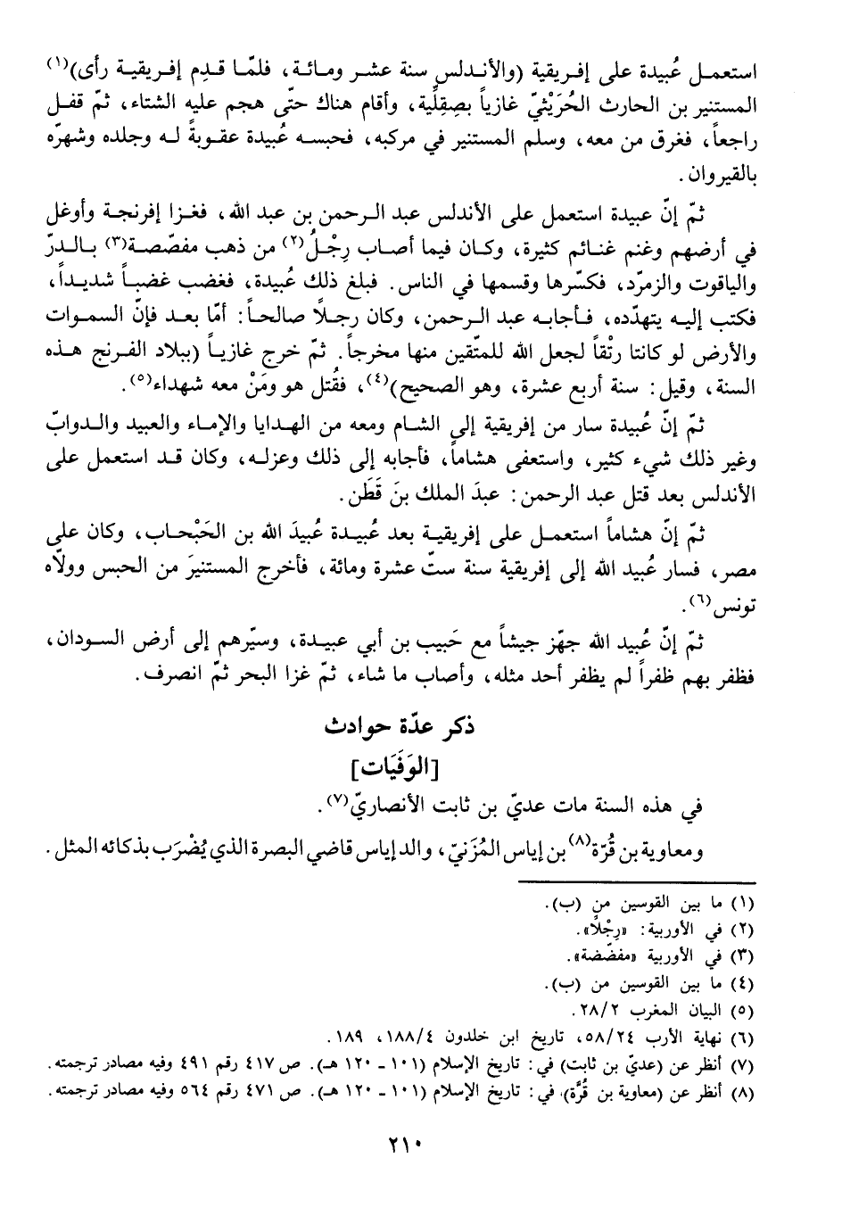 ثُمَّ إِنَّ عُبَيْدَةَ سَارَ مِنْ إِفْرِيقِيَّةَ إِلَى الشَّامِ وَمَعَهُ مِنَ الْهَدَايَا وَالْإِمَاءِ وَالْعَبِيدِ وَالدَّوَابِّ وَغَيْرِ ذَلِكَ شَيْءٌ كَثِيرٌ، وَاسْتَعْفَى هِشَامًا، فَأَجَابَهُ إِلَى ذَلِكَ وَعَزَلَهُ، وَكَانَ قَدِ اسْتَعْمَلَ عَلَى الْأَنْدَلُسِ بَعْدَ قَتْلِ عَبْدِ الرَّحْمَنِ عَبْدَ الْمَلِكِ بْنَ قَطَنٍ.