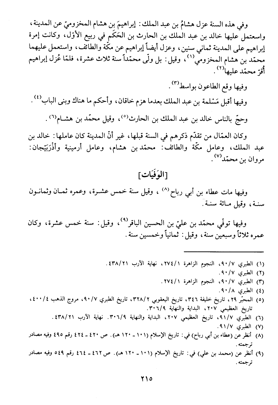 وَحَجَّ بِالنَّاسِ خَالِدُ بْنُ عَبْدِ الْمَلِكِ بْنِ الْحَارِثِ، وَقِيلَ مُحَمَّدُ بْنُ هِشَامٍ. وَكَانَ الْعُمَّالُ مَنْ تَقَدَّمَ ذِكْرُهُمْ فِي السَّنَةِ قَبْلَهَا، غَيْرَ أَنَّ الْمَدِينَةَ كَانَ عَامِلُهَا خَالِدَ بْنَ عَبْدِ الْمَلِكِ، وَعَامِلُ مَكَّةَ وَالطَّائِفِ مُحَمَّدَ بْنَ هِشَامٍ، وَعَامِلُ إِرْمِينِيَّةَ وَأَذْرَبِيجَانَ مَرْوَانَ بْنَ مُحَمَّدٍ.