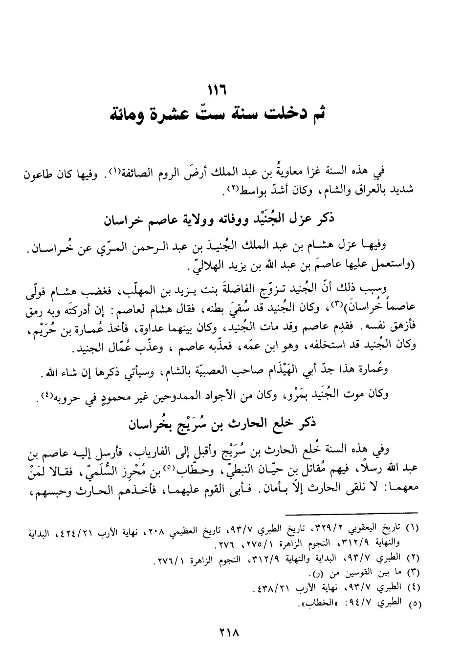 وَفِيهَا عَزَلَ هِشَامُ بْنُ عَبْدِ الْمَلِكِ الْجُنَيْدَ بْنَ عَبْدِ الرَّحْمَنِ الْمُرِّيَّ عَنْ خُرَاسَانَ، (وَاسْتَعْمَلَ عَلَيْهَا عَاصِمَ بْنَ عَبْدِ اللَّهِ بْنِ يَزِيدَ الْهِلَالِيَّ.