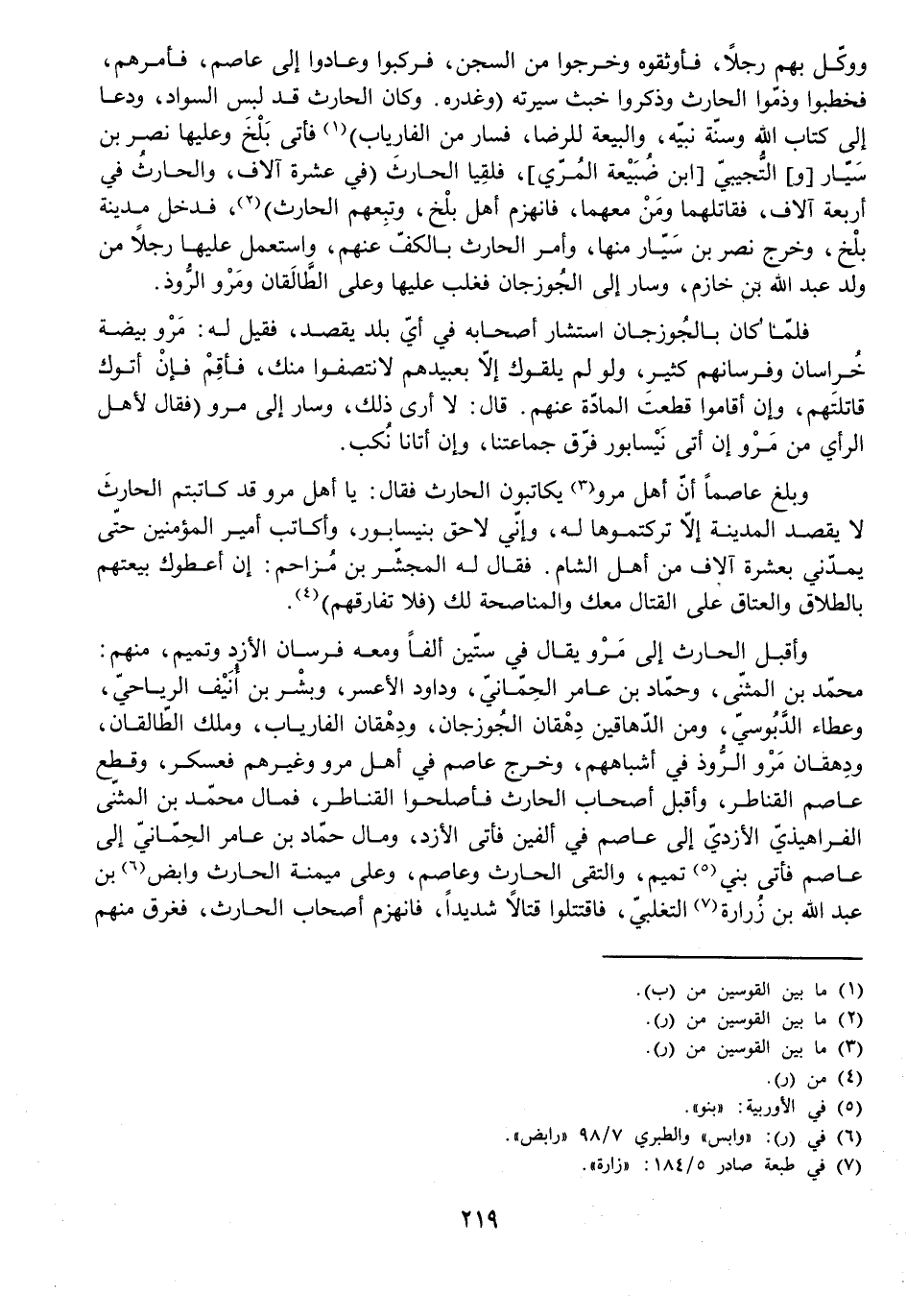 وَوَكَّلَ بِهِمْ رَجُلًا، فَأَوْثَقُوهُ وَخَرَجُوا مِنَ السِّجْنِ فَرَكِبُوا وَعَادُوا إِلَى عَاصِمٍ، فَأَمَرَهُمْ، فَخَطَبُوا وَذَمُّوا الْحَارِثَ وَذَكَرُوا خُبْثَ سِيرَتِهِ (وَغَدْرَهُ. وَكَانَ الْحَارِثُ قَدْ لَبِسَ السَّوَادَ وَدَعَا إِلَى كِتَابِ اللَّهِ وَسُنَّةِ نَبِيِّهِ وَالْبَيْعَةِ لِلرِّضَا، فَسَارَ مِنَ الْفَارِيَابِ) فَأَتَى بَلْخًا وَعَلَيْهَا نَصْرُ بْنُ سَيَّارٍ [وَ] التُّجِيبِيُّ [ابْنُ ضُبَيْعَةَ الْمُرِّيُّ] ، فَلَقِيَا الْحَارِثَ (فِي عَشَرَةِ آلَافٍ وَالْحَارِثُ فِي أَرْبَعَةِ آلَافٍ فَقَاتَلَهُمَا وَمَنْ مَعَهُمَا، فَانْهَزَمَ أَهْلُ بَلْخٍ وَتَبِعَهُمُ الْحَارِثُ) ، فَدَخَلَ مَدِينَةَ بَلْخٍ، وَخَرَجَ نَصْرُ بْنُ سَيَّارٍ مِنْهَا، وَأَمَرَ الْحَارِثَ بِالْكَفِّ عَنْهُمْ، وَاسْتَعْمَلَ عَلَيْهَا رَجُلًا مِنْ وَلَدِ عَبْدِ اللَّهِ بْنِ خَازِمٍ، وَسَارَ إِلَى الْجُوزَجَانِ فَغُلِبَ عَلَيْهَا وَعَلَى الطَّالَقَانِ وَمَرْوِ الرُّوذِ.