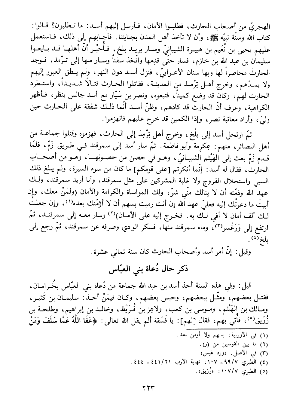 الْهَجَرِيُّ مِنْ أَصْحَابِ الْحَارِثِ، فَطَلَبُوا الْأَمَانَ، فَأَرْسَلَ إِلَيْهِمْ أَسَدٌ: مَا تَطْلُبُونَ؟ قَالُوا: كِتَابَ اللَّهِ وَسُنَّةَ نَبِيِّهِ، صَلَّى اللَّهُ عَلَيْهِ وَسَلَّمَ، وَأَنْ لَا تَأْخُذَ أَهْلَ الْمُدُنِ بِجِنَايَتِنَا. فَأَجَابَهُمْ إِلَى ذَلِكَ، فَاسْتَعْمَلَ عَلَيْهِمْ يَحْيَى بْنَ نُعَيْمِ بْنِ هُبَيْرَةَ الشَّيْبَانِيَّ وَسَارَ يُرِيدُ بَلْخًا، فَأُخْبِرَ أَنَّ أَهْلَهَا قَدْ بَايَعُوا سُلَيْمَانَ بْنَ عَبْدِ اللَّهِ بْنِ خَازِمٍ، فَسَارَ حَتَّى قَدِمَهَا وَاتَّخَذَ سُفُنًا وَسَارَ مِنْهَا إِلَى تِرْمِذَ، فَوَجَدَ الْحَارِثَ مُحَاصِرًا لَهَا، وَبِهَا سِنَانٌ الْأَعْرَابِيُّ، فَنَزَلَ أَسَدٌ دُونَ النَّهْرِ وَلَمْ يُطِقِ الْعُبُورَ إِلَيْهِمْ وَلَا يُمِدُّهُمْ، وَخَرَجَ أَهْلُ تِرْمِذَ مِنَ الْمَدِينَةِ فَقَاتَلُوا الْحَارِثَ قِتَالًا شَدِيدًا، وَاسْتَطْرَدَ الْحَارِثُ لَهُمْ، وَكَانَ قَدْ وَضَعَ كَمِينًا، فَتَبِعُوهُ، وَنَصْرُ بْنُ سَيَّارٍ مَعَ أَسَدٍ جَالِسٌ يَنْظُرُ، فَأَظْهَرَ الْكَرَاهِيَةَ، وَعَرَفَ أَنَّ الْحَارِثَ قَدْ كَادَهُمْ، وَظَنَّ أَسَدٌ أَنَّمَا ذَلِكَ شَفَقَةٌ عَلَى الْحَارِثِ حِينَ وَلِيَ، وَأَرَادَ مُعَاتَبَةَ نَصْرٍ، وَإِذَا الْكَمِينُ قَدْ خَرَجَ عَلَيْهِمْ فَانْهَزَمُوا.