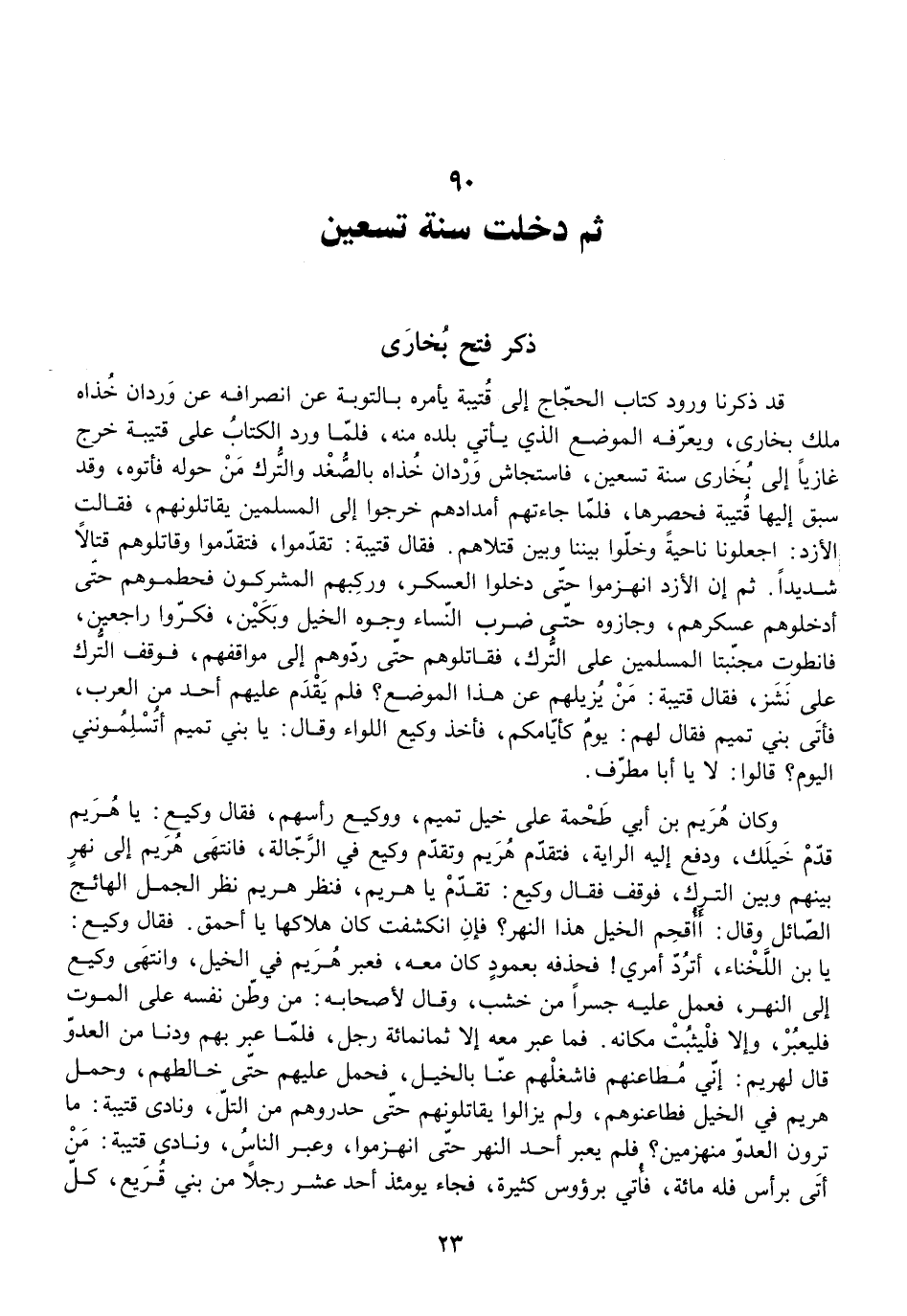 قَدْ ذَكَرْنَا وُرُودَ كِتَابِ الْحَجَّاجِ إِلَى قُتَيْبَةَ يَأْمُرُهُ بِالتَّوْبَةِ عَنِ انْصِرَافِهِ عَنْ وَرْدَانَ خُذَاهْ مَلِكَ بُخَارَى، وَيُعَرِّفُهُ الْمَوْضِعَ الَّذِي يَأْتِي بَلَدَهُ مِنْهُ، فَلَمَّا وَرَدَ الْكِتَابُ عَلَى قُتَيْبَةَ خَرَجَ غَازِيًا إِلَى بُخَارَى سَنَةَ تِسْعِينَ، فَاسْتَجَاشَ وَرَدَانُ خُذَاهُ بِالصُّغْدِ وَالتُّرْكِ مِنْ حَوْلِهِ فَأَتَوْهُ، وَقَدْ سَبَقَ إِلَيْهَا قُتَيْبَةُ فَحَصَرَهَا، فَلَمَّا جَاءَتْهُمْ أَمْدَادُهُمْ خَرَجُوا إِلَى الْمُسْلِمِينَ يُقَاتِلُونَهُمْ، فَقَالَتِ الْأَزْدُ: اجْعَلُونَا نَاحِيَةً وَخَلُّوا بَيْنَنَا وَبَيْنَ قِتَالِهِمْ. فَقَالَ قُتَيْبَةُ: تَقَدَّمُوا، فَتَقَدَّمُوا وَقَاتَلُوهُمْ قِتَالًا شَدِيدًا، ثُمَّ إِنَّ الْأَزْدَ انْهَزَمُوا حَتَّى دَخَلُوا الْعَسْكَرَ، وَرَكِبَهُمُ الْمُشْرِكُونَ فَحَطَّمُوهُمْ حَتَّى أَدْخَلُوهُمْ عَسْكَرَهُمْ، وَجَازُوهُ حَتَّى ضَرَبَ النِّسَاءُ وُجُوهَ الْخَيْلِ وَبَكَيْنَ، فَكَرُّوا رَاجِعِينَ، فَانْطَوَتْ مُجَنِّبَتَا الْمُسْلِمِينَ عَلَى التُّرْكِ، فَقَاتَلُوهُمْ حَتَّى رَدُّوهُمْ إِلَى مَوَاقِفِهِمْ، فَوَقَفَ التُّرْكُ عَلَى نَشَزٍ، فَقَالَ قُتَيْبَةُ: مَنْ يُزِيلُهُمْ عَنْ هَذَا الْمَوْضِعِ؟ فَلَمْ يَقْدُمْ عَلَيْهِمْ أَحَدٌ مِنَ الْعَرَبِ، فَأَتَى بَنِي تَمِيمٍ، فَقَالَ لَهُمْ: يَوْمٌ كَأَيَّامِكُمْ، فَأَخَذَ وَكِيعٌ اللِّوَاءَ وَقَالَ: يَا بَنِي تَمِيمٍ أَتُسَلِّمُونَنِي الْيَوْمَ؟ قَالُوا: لَا يَا أَبَا مُطَرِّفٍ.