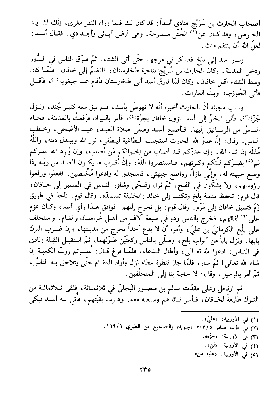 أَصْحَابِ الْحَارِثِ بْنِ سُرَيْجٍ فَنَادَى أَسَدًا: قَدْ كَانَ لَكَ فِيمَا وَرَاءَ النَّهْرِ مَغْزًى، إِنَّكَ لَشَدِيدُ الْحِرْصِ، وَقَدْ كَانَ عَنِ الْخُتُّلِ مَنْدُوحَةٌ وَهِيَ أَرْضُ آبَائِي وَأَجْدَادِي. فَقَالَ أَسَدٌ: لَعَلَّ اللَّهَ أَنْ يَنْتَقِمَ مِنْكَ.