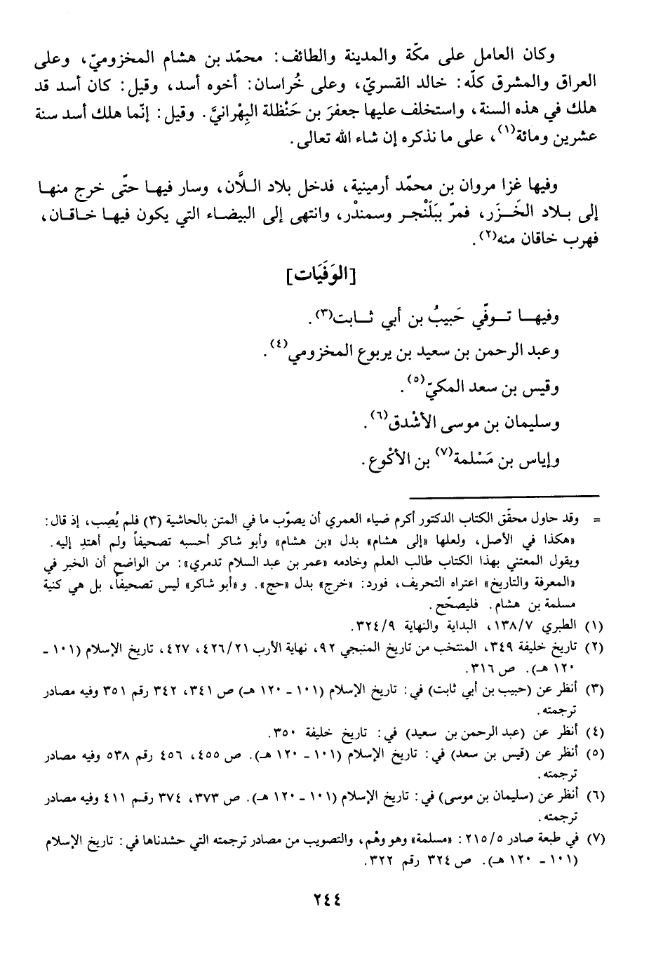 وَكَانَ الْعَامِلَ عَلَى مَكَّةَ وَالْمَدِينَةِ وَالطَّائِفِ مُحَمَّدُ بْنُ هِشَامٍ الْمَخْزُومِيُّ، وَعَلَى الْعِرَاقِ وَالْمَشْرِقِ كُلِّهِ خَالِدٌ الْقَسْرِيُّ، وَعَلَى خُرَاسَانَ أَخُوهُ أَسَدٌ، وَقِيلَ: كَانَ أَسَدٌ قَدْ هَلَكَ فِي هَذِهِ السَّنَةِ وَاسْتَخْلَفَ عَلَيْهَا جَعْفَرَ بْنَ حَنْظَلَةَ الْبَهْرَانِيَّ. وَقِيلَ: إِنَّمَا هَلَكَ أَسَدٌ سَنَةَ عِشْرِينَ وَمِائَةٍ، عَلَى مَا نَذْكُرُهُ إِنْ شَاءَ اللَّهُ تَعَالَى.