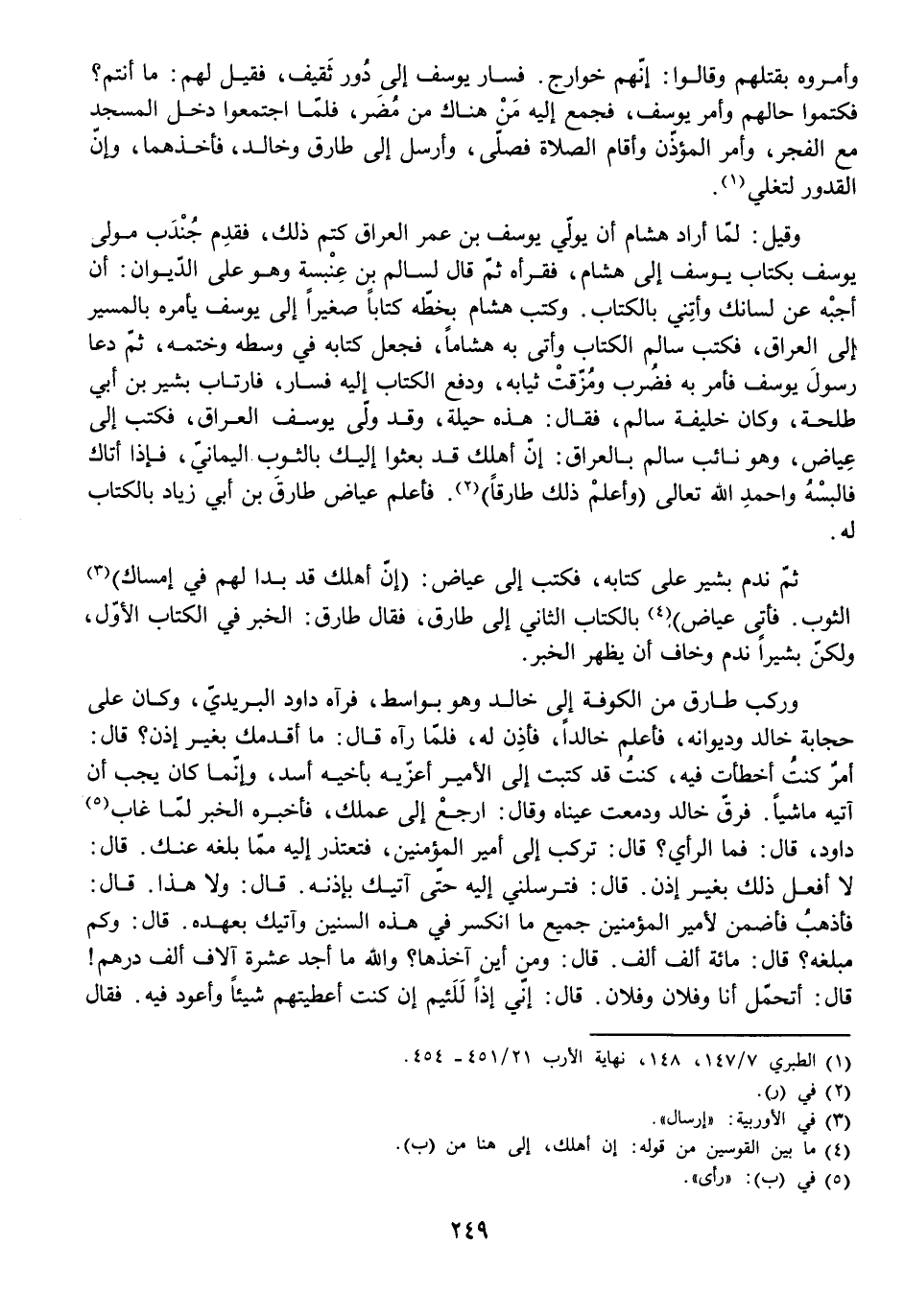 وَقِيلَ: لَمَّا أَرَادَ هِشَامٌ أَنْ يُوَلِّيَ يُوسُفَ بْنَ عُمَرَ الْعِرَاقَ كَتَمَ ذَلِكَ، فَقَدِمَ جُنْدُبٌ مَوْلَى يُوسُفَ بِكِتَابِ يُوسُفَ إِلَى هِشَامٍ، فَقَرَأَهُ ثُمَّ قَالَ لِسَالِمِ بْنِ عَنْبَسَةَ وَهُوَ عَلَى الدِّيوَانِ: أَنْ أَجِبْهُ عَنْ لِسَانِكَ وَأْتِنِي بِالْكِتَابِ. وَكَتَبَ هِشَامٌ بِخَطِّهِ كِتَابًا صَغِيرًا إِلَى يُوسُفَ يَأْمُرُهُ بِالْمَسِيرِ إِلَى الْعِرَاقِ، فَكَتَبَ سَالِمٌ الْكِتَابَ وَأَتَى بِهِ هِشَامًا، فَجَعَلَ كِتَابَهُ فِي وَسَطِهِ وَخَتَمَهُ، ثُمَّ دَعَا رَسُولَ يُوسُفَ فَأَمَرَ بِهِ فَضُرِبَ وَمُزِّقَتْ ثِيَابَهُ، وَدَفَعَ الْكِتَابَ إِلَيْهِ فَسَارَ. فَارْتَابَ بَشِيرُ بْنُ أَبِي طَلْحَةَ، وَكَانَ خَلِيفَةَ سَالِمٍ، فَقَالَ: هَذِهِ حِيلَةٌ، وَقَدْ وَلَّى يُوسُفَ الْعِرَاقَ، فَكَتَبَ إِلَى عِيَاضٍ، وَهُوَ نَائِبُ سَالِمٍ بِالْعِرَاقِ: إِنَّ أَهْلَكَ قَدْ بَعَثُوا إِلَيْكَ بِالثَّوْبِ الْيَمَانِيِّ، فَإِذَا أَتَاكَ فَالْبَسْهُ، وَاحَمْدِ اللَّهَ تَعَالَى، (وَأَعْلِمْ ذَلِكَ طَارِقًا) . فَأَعْلَمَ عِيَاضٌ طَارِقَ بْنَ أَبِي زِيَادٍ بِالْكِتَابِ لَهُ.