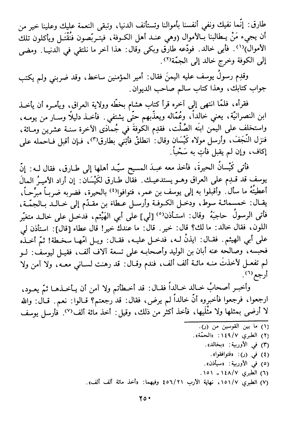 فَأَتَى كَيْسَانُ الْحِيرَةَ فَأَخَذَ مَعَهُ عَبْدَ الْمَسِيحِ سَيِّدَ أَهْلِهَا إِلَى طَارِقٍ، فَقَالَ لَهُ: إِنَّ يُوسُفَ قَدْ قَدِمَ عَلَى الْعِرَاقِ وَهُوَ يَسْتَدْعِيكَ. فَقَالَ طَارِقٌ لَكَيْسَانَ: إِنْ أَرَادَ الْأَمِيرُ الْمَالَ أَعْطَيْتُهُ مَا سَأَلَ. وَأَقْبَلُوا بِهِ إِلَى يُوسُفَ بْنِ عُمَرَ فَتَوَافَوْا بِالْحِيرَةِ، فَضَرَبَهُ ضَرْبًا مُبَرِّحًا، يُقَالُ خَمْسُمِائَةِ سَوْطٍ، وَدَخَلَ الْكُوفَةَ، وَأَرْسَلَ عَطَاءَ بْنَ مُقَدِّمٍ إِلَى خَالِدٍ بِالْجَمَّةِ، فَأَتَى الرَّسُولُ حَاجِبَهُ وَقَالَ: اسْتَأْذِنْ [لِي] عَلَى أَبِي الْهَيْثَمِ، فَدَخَلَ عَلَى خَالِدٍ مُتَغَيِّرَ اللَّوْنِ، فَقَالَ خَالِدٌ: مَا لَكَ؟ قَالَ: خَيْرٌ. قَالَ: مَا عِنْدَكَ خَيْرٌ! قَالَ: عَطَاءٌ [قَالَ] : اسْتَأْذِنْ لِي عَلَى أَبِي الْهَيْثَمِ. فَقَالَ: ايذَنْ لَهُ، فَدَخَلَ عَلَيْهِ، فَقَالَ: وَيْلُ أُمِّهَا سَخْطَةٌ! ثُمَّ أَخَذَهُ فَحَبَسَهُ، وَصَالَحَهُ عَنْهُ أَبَانُ بْنُ الْوَلِيدِ وَأَصْحَابُهُ عَلَى تِسْعَةِ آلَافِ أَلْفٍ، فَقِيلَ لِيُوسُفَ: لَوْ لَمْ تَفْعَلْ لَأَخَذْتَ مِنْهُ مِائَةَ أَلْفِ أَلْفٍ، فَنَدِمَ وَقَالَ: قَدْ رَهَنْتُ لِسَانِي مَعَهُ وَلَا آمَنُ وَلَا أَرْجِعُ.