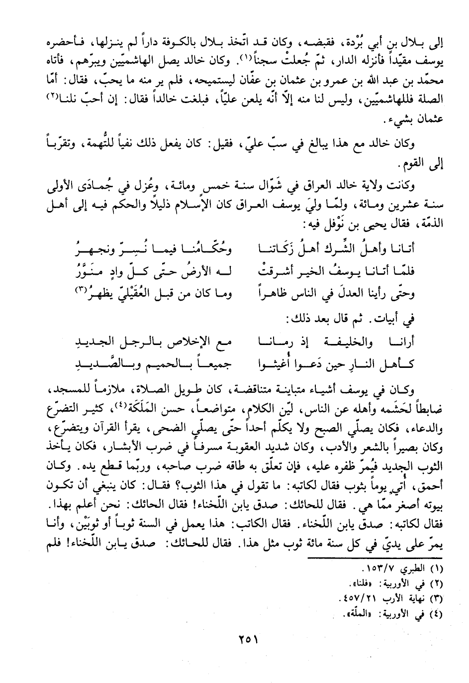 إِلَى بِلَالِ بْنِ أَبِي بُرْدَةَ، فَقَبَضَهُ، وَكَانَ قَدِ اتَّخَذَ بِلَالٌ بِالْكُوفَةِ دَارًا لَمْ يَنْزِلْهَا، فَأَحْضَرَهُ يُوسُفُ مُقَيَّدًا فَأَنْزَلَهُ الدَّارَ، ثُمَّ جُعِلَتْ سِجْنًا. وَكَانَ خَالِدٌ يَصِلُ الْهَاشِمِيِّينَ وَيَبَرُّهُمْ، فَأَتَاهُ مُحَمَّدُ بْنُ عَبْدِ اللَّهِ بْنِ عَمْرِو بْنِ عُثْمَانَ بْنِ عَفَّانَ لِيَسْتَحْمِيَهُ فَلَمْ يَرَ مِنْهُ مَا يُحِبُّ، فَقَالَ: أَمَّا الصِّلَةُ فَلِلْهَاشِمِيِّينَ، وَلَيْسَ لَنَا مِنْهُ إِلَّا أَنَّهُ يَلْعَنُ عَلِيًّا، فَبَلَغَتْ خَالِدًا فَقَالَ: إِنْ أَحَبَّ نِلْنَا عُثْمَانَ بِشَيْءٍ.