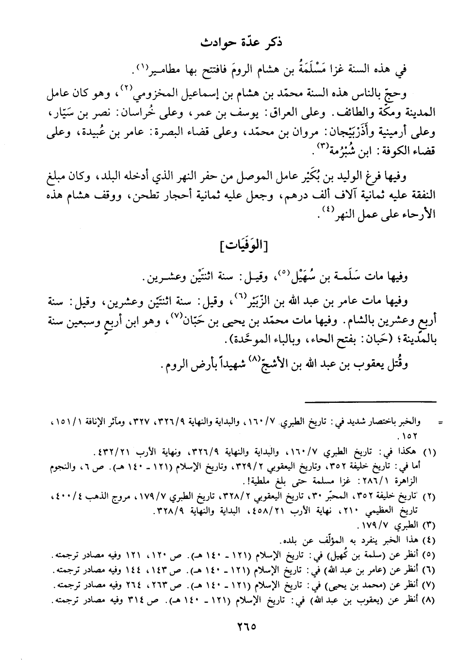 وَفِيهَا مَاتَ سَلَمَةُ بْنُ سُهَيْلٍ، وَقِيلَ سَنَةَ اثْنَتَيْنِ وَعِشْرِينَ. وَفِيهَا مَاتَ عَامِرُ بْنُ عَبْدِ اللَّهِ بْنِ الزُّبَيْرِ، وَقِيلَ سَنَةَ اثْنَتَيْنِ وَعِشْرِينَ، وَقِيلَ سَنَةَ أَرْبَعٍ وَعِشْرِينَ بِالشَّامِ. وَفِيهَا مَاتَ مُحَمَّدُ بْنُ يَحْيَى بْنِ حَبَّانَ وَهُوَ ابْنُ أَرْبَعٍ وَسَبْعِينَ سَنَةً بِالْمَدِينَةِ، (حَبَّانُ: بِفَتْحِ الْحَاءِ، وَبِالْبَاءِ الْمُوَحَّدَةِ) . وَقُتِلَ يَعْقُوبُ بْنُ عَبْدِ اللَّهِ بْنِ الْأَشَجِّ شَهِيدًا بِأَرْضِ الرُّومِ.