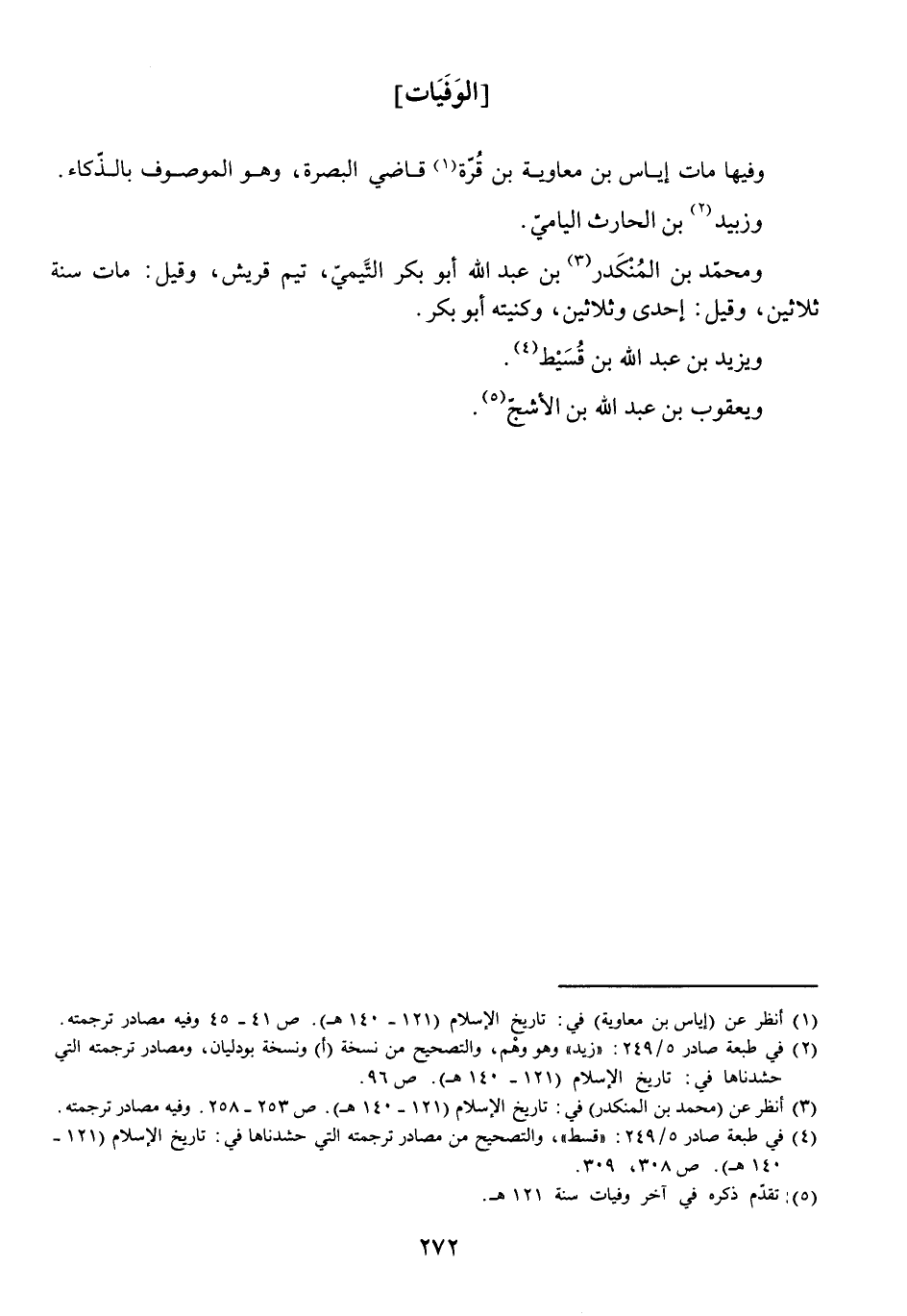 وَفِيهَا مَاتَ إِيَاسُ بْنُ مُعَاوِيَةَ بْنِ قُرَّةَ قَاضِي الْبَصْرَةِ، وَهُوَ الْمَوْصُوفُ بِالذَّكَاءِ، وَزَيْدُ بْنُ الْحَارِثِ الْيَامِيُّ، وَمُحَمَّدُ بْنُ الْمُنْكَدِرِ بْنِ عَبْدِ اللَّهِ أَبُو بَكْرٍ التَّيْمِيُّ، تَيْمُ قُرَيْشٍ، وَقِيلَ: مَاتَ سَنَةَ ثَلَاثِينَ، وَقِيلَ: إِحْدَى وَثَلَاثِينَ، وَكُنْيَتُهُ أَبُو بَكْرٍ، وَيَزِيدُ بْنُ عَبْدِ اللَّهِ بْنِ قِسْطٍ، وَيَعْقُوبُ بْنُ عَبْدِ اللَّهِ بْنِ الْأَشَجِّ.