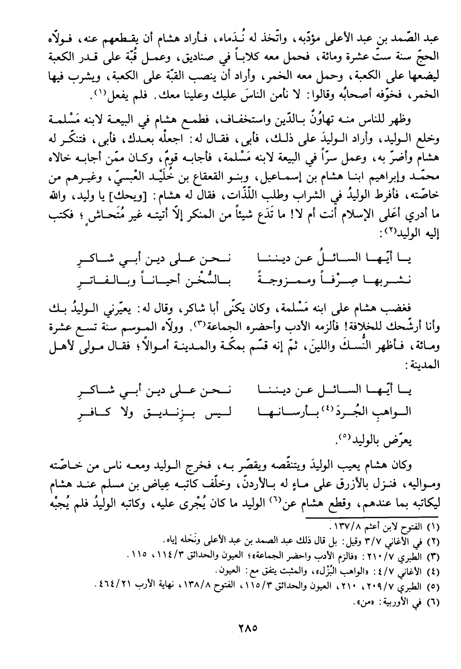 وَظَهَرَ لِلنَّاسِ مِنْهُ تَهَاوُنٌ بِالدِّينِ وَاسْتِخْفَافٌ، فَطَمِعَ هِشَامٌ فِي الْبَيْعَةِ لِابْنِهِ مَسْلَمَةَ وَخَلْعِ الْوَلِيدِ، وَأَرَادَ الْوَلِيدَ عَلَى ذَلِكَ، فَأَبَى، فَقَالَ لَهُ: اجْعَلْهُ بَعْدَكَ، فَأَبَى، فَتَنَكَّرَ لَهُ هِشَامٌ وَأَضَرَّ بِهِ وَعَمِلَ سِرًّا فِي الْبَيْعَةِ لِابْنِهِ مَسْلَمَةَ، فَأَجَابَهُ قَوْمٌ، وَكَانَ مِمَّنْ أَجَابَهُ خَالَاهُ مُحَمَّدٌ وَإِبْرَاهِيمُ ابْنَا هِشَامِ بْنِ إِسْمَاعِيلَ، وَبَنُو الْقَعْقَاعِ بْنِ خُلَيْدٍ الْعَبْسِيِّ، وَغَيْرُهُمْ مِنْ خَاصَّتِهِ، فَأَفْرَطَ الْوَلِيدُ فِي الشَّرَابِ وَطَلَبِ اللَّذَّاتِ، فَقَالَ لَهُ هِشَامٌ: وَيْحَكَ يَا وَلِيدُ، وَاللَّهِ مَا أَدْرِي أَعَلَى الْإِسْلَامِ أَنْتَ أَمْ لَا! مَا تَدَعُ شَيْئًا مِنَ الْمُنْكَرِ إِلَّا أَتَيْتَهُ غَيْرَ مُتَحَاشٍ، فَكَتَبَ إِلَيْهِ الْوَلِيدُ: