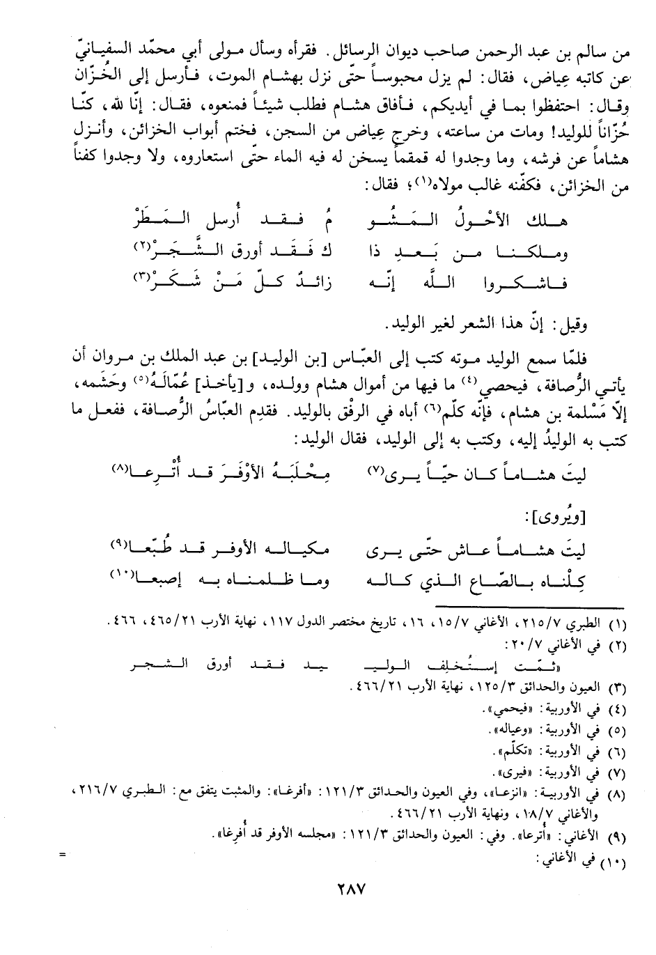 مِنْ سَالِمِ بْنِ عَبْدِ الرَّحْمَنِ صَاحِبِ دِيوَانِ الرَّسَائِلِ. فَقَرَأَهُ وَسَأَلَ مَوْلَى أَبِي مُحَمَّدٍ السُّفْيَانِيِّ عَنْ كَاتِبِهِ عِيَاضٍ، فَقَالَ: لَمْ يَزَلْ مَحْبُوسًا حَتَّى نَزَلَ بِهِشَامٍ الْمَوْتُ، فَأَرْسَلَ إِلَى الْخُزَّانِ وَقَالَ: احْتَفِظُوا بِمَا فِي أَيْدِيكُمْ، فَأَفَاقَ هِشَامٌ فَطَلَبَ شَيْئًا فَمَنَعُوهُ، فَقَالَ: إِنَّا لِلَّهِ، كُنَّا خُزَّانًا لِلْوَلِيدِ! وَمَاتَ مِنْ سَاعَتِهِ، وَخَرَجَ عِيَاضٌ مِنَ السِّجْنِ، فَخَتَمَ أَبْوَابَ الْخَزَائِنِ وَأَنْزَلَ هِشَامًا عَنْ فَرْشِهِ، وَمَا وَجَدُوا لَهُ قُمْقُمًا يُسَخَّنُ لَهُ فِيهِ الْمَاءُ حَتَّى اسْتَعَارُوهُ، وَلَا وَجَدُوا كَفَنًا مِنَ الْخَزَائِنِ فَكَفَّنَهُ غَالِبٌ مَوْلَاهُ، فَقَالَ:
