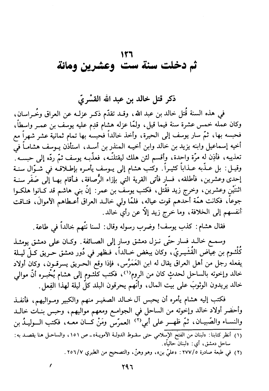 فِي هَذِهِ السَّنَةِ قُتِلَ خَالِدُ بْنُ عَبْدِ اللَّهِ، وَقَدْ تَقَدَّمَ ذِكْرُ عَزْلِهِ عَنِ الْعِرَاقِ وَخُرَاسَانَ، وَكَانَ عَمَلُهُ خَمْسَ عَشْرَةَ سَنَةً فِيمَا قِيلَ، وَلَمَّا عَزَلَهُ هِشَامٌ قَدِمَ عَلَيْهِ يُوسُفُ بْنُ عُمَرَ وَاسِطًا فَحَبَسَهُ بِهَا، ثُمَّ سَارَ يُوسُفُ إِلَى الْحِيرَةِ وَأَخَذَ خَالِدًا فَحَبَسَهُ بِهَا ثَمَانِيَةَ عَشَرَ شَهْرًا مَعَ أَخِيهِ إِسْمَاعِيلَ وَابْنِهِ يَزِيدَ بْنِ خَالِدٍ وَابْنِ أَخِيهِ الْمُنْذِرِ بْنِ أَسَدٍ. اسْتَأْذَنَ يُوسُفُ هِشَامًا فِي تَعْذِيبِهِ فَأَذِنَ لَهُ مَرَّةً وَاحِدَةً، وَأَقْسَمَ لَئِنْ هَلَكَ لَيَقْتُلَنَّهُ، فَعَذَّبَهُ يُوسُفُ ثُمَّ رَدَّهُ إِلَى حَبْسِهِ. وَقِيلَ: بَلْ عَذَّبَهُ عَذَابًا كَثِيرًا، وَكَتَبَ هِشَامٌ إِلَى يُوسُفَ يَأْمُرُهُ بِإِطْلَاقِهِ فِي شَوَّالٍ سَنَةَ إِحْدَى وَعِشْرِينَ، فَأَطْلَقَهُ، فَسَارَ فَأَتَى الْقَرْيَةَ الَّتِي بِإِزَاءِ الرُّصَافَةِ فَأَقَامَ بِهَا إِلَى صَفَرٍ سَنَةَ اثْنَتَيْنِ وَعِشْرِينَ، وَخَرَجَ زَيْدٌ فَقُتِلَ، فَكَتَبَ يُوسُفُ بْنُ عُمَرَ: إِنَّ بَنِي هَاشِمٍ قَدْ كَانُوا هَلَكُوا جُوعًا فَكَانَتْ هِمَّةُ أَحَدِهِمْ قُوتَ عِيَالِهِ، فَلَمَّا وَلِيَ خَالِدٌ الْعِرَاقَ أَعْطَاهُمُ الْأَمْوَالَ، فَتَاقَتْ أَنْفُسُهُمْ إِلَى الْخِلَافَةِ، وَمَا خَرَجَ زَيْدٌ إِلَّا عَنْ رَأْيِ خَالِدٍ.