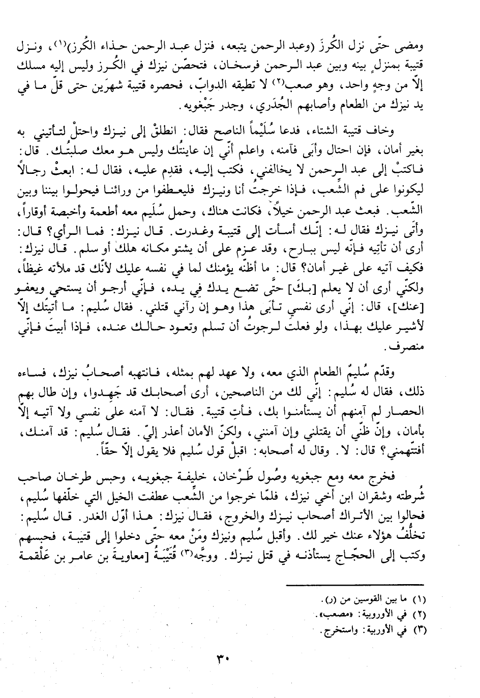 وَخَافَ قُتَيْبَةُ الشِّتَاءَ، فَدَعَا سُلَيْمًا النَّاصِحَ، فَقَالَ: انْطَلِقْ إِلَى نِيزَكَ وَاحْتَلْ لِتَأْتِيَنِي بِهِ بِغَيْرِ أَمَانٍ، فَإِنِ احْتَالَ وَأَبَى فَآمِنْهُ، وَاعْلَمْ أَنِّي إِنْ عَايَنْتُكَ وَلَيْسَ هُوَ مَعَكَ صَلَبْتُكَ. قَالَ: فَاكْتُبْ إِلَى عَبْدِ الرَّحْمَنِ لَا يُخَالِفْنِي، فَكَتَبَ إِلَيْهِ، فَقَدِمَ عَلَيْهِ، فَقَالَ لَهُ: ابْعَثْ رِجَالًا لِيَكُونُوا عَلَى فَمِ الشِّعْبِ، فَإِذَا خَرَجْتُ أَنَا وَنِيزَكُ فَلْيَعْطِفُوا مِنْ وَرَائِنَا فَيَحُولُوا بَيْنَنَا وَبَيْنَ الشِّعْبِ، فَبَعَثَ عَبْدُ الرَّحْمَنِ خَيْلًا، فَكَانَتْ هُنَاكَ، وَحَمَلَ سُلَيْمٌ مَعَهُ أَطْعِمَةً وَأَخْبِصَةً أَوَقَارًا، وَأَتَى نِيزَكَ، فَقَالَ لَهُ: إِنَّكَ أَسَأْتَ إِلَى قُتَيْبَةَ وَغَدَرْتَ. قَالَ نِيزَكُ: فَمَا الرَّأْيُ؟ قَالَ: أَرَى أَنْ تَأْتِيَهُ فَإِنَّهُ لَيْسَ بِبَارِحٍ، وَقَدْ عَزَمَ عَلَى أَنْ يَشْتُوَ مَكَانَهُ هَلَكَ أَوْ سَلِمَ. قَالَ نِيزَكُ: فَكَيْفَ آتِيهِ عَلَى غَيْرِ أَمَانٍ؟ قَالَ: مَا أَظُنُّهُ يُؤَمِّنُكَ; لِمَا فِي نَفْسِهِ عَلَيْكَ; لِأَنَّكَ قَدْ مَلَأْتَهُ غَيْظًا، وَلَكِنِّي أَرَى أَنْ لَا يَعْلَمَ [بِكَ] حَتَّى تَضَعَ يَدَكَ فِي يَدِهِ، فَإِنِّي أَرْجُو أَنْ يَسْتَحِيَ وَيَعْفُوَ [عَنْكَ] ، قَالَ: إِنِّي أَرَى نَفْسِي تَأْبَى هَذَا وَهُوَ إِنْ رَآنِي قَتَلَنِي، فَقَالَ سُلَيْمٌ: مَا أَتَيْتُكَ إِلَّا لِأُشِيرَ عَلَيْكَ بِهَذَا، وَلَوْ فَعَلْتَ لَرَجَوْتُ أَنْ تَسْلَمَ وَتَعُودَ حَالُكَ عِنْدَهُ، فَإِذَا أَبَيْتَ فَإِنِّي مُنْصَرِفٌ.