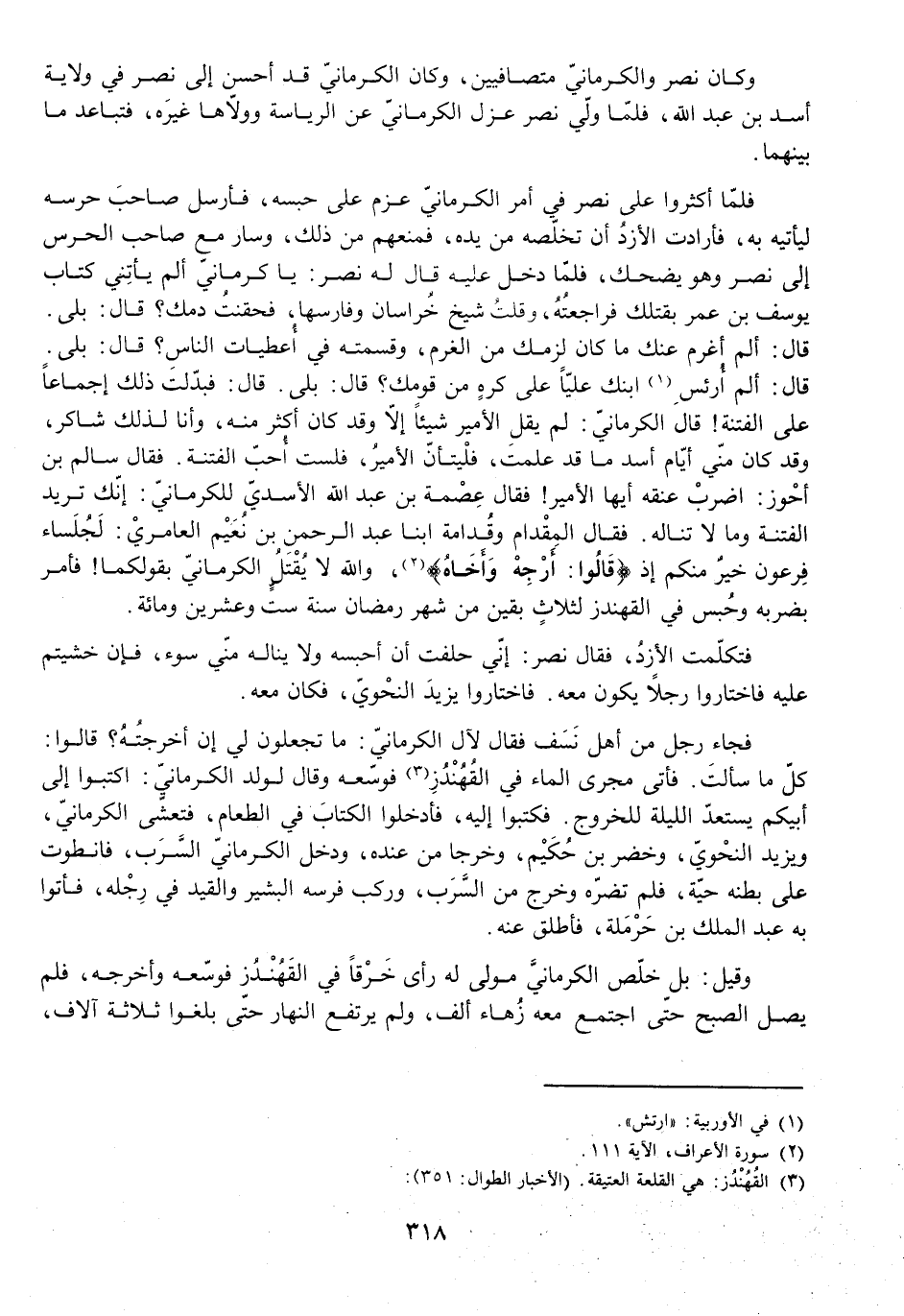 فَلَمَّا أَكْثَرُوا عَلَى نَصْرٍ فِي أَمْرِ الْكَرْمَانِيِّ عَزَمَ عَلَى حَبْسِهِ، فَأَرْسَلَ صَاحِبَ حَرَسِهِ لِيَأْتِيَهُ بِهِ، فَأَرَادَتِ الْأَزْدُ أَنْ تُخَلِّصَهُ مِنْ يَدِهِ، فَمَنَعَهُمْ مِنْ ذَلِكَ وَسَارَ مَعَ صَاحِبِ الْحَرَسِ إِلَى نَصْرٍ وَهُوَ يَضْحَكُ، فَلَمَّا دَخَلَ عَلَيْهِ قَالَ لَهُ نَصْرٌ: يَا كِرْمَانِيُّ أَلَمْ يَأْتِنِي كِتَابُ يُوسُفَ بْنِ عُمَرَ بِقَتْلِكَ فَرَاجَعْتُهُ، وَقُلْتُ: شَيْخُ خُرَاسَانَ وَفَارِسُهَا فَحَقَنْتُ دَمَكَ؟ قَالَ: بَلَى. قَالَ: أَلَمْ أَغْرَمْ عَنْكَ مَا كَانَ لَزِمَكَ مِنَ الْغُرْمِ، وَقَسَّمْتُهُ فِي أَعْطِيَاتِ النَّاسِ؟ قَالَ: بَلَى. قَالَ: أَلَمْ أُرَئِّسِ ابْنَكَ عَلِيًّا عَلَى كُرْهٍ مِنْ قَوْمِكَ؟ قَالَ: بَلَى. قَالَ: فَبَدَّلْتَ ذَلِكَ إِجْمَاعًا عَلَى الْفِتْنَةِ! قَالَ الْكَرْمَانِيُّ: لَمْ يَقُلِ الْأَمِيرُ شَيْئًا إِلَّا وَقَدْ كَانَ أَكْثَرَ مِنْهُ، وَأَنَا لِذَلِكَ شَاكِرٌ، وَقَدْ كَانَ مِنِّي أَيَّامَ أَسَدٍ مَا قَدْ عَلِمْتَ فَلْيَتَأَنَّ الْأَمِيرُ فَلَسْتُ أُحِبُّ الْفِتْنَةَ. فَقَالَ سَالِمُ بْنُ أَحْوَزَ: اضْرِبْ عُنُقَهُ أَيُّهَا الْأَمِيرُ! فَقَالَ عِصْمَةُ بْنُ عَبْدِ اللَّهِ الْأَسَدِيُّ لِلْكِرْمَانِيِّ: إِنَّكَ تُرِيدُ الْفِتْنَةَ وَمَا لَا تَنَالُهُ. فَقَالَ الْمِقْدَامُ وَقُدَامَةُ ابْنَا عَبْدِ الرَّحْمَنِ بْنِ نُعَيْمٍ الْعَامِرِيِّ: لَجُلَسَاءُ فِرْعَوْنَ خَيْرٌ مِنْكُمْ إِذْ {قَالُوا أَرْجِهْ وَأَخَاهُ} [الأعراف: 111] ، وَاللَّهِ لَا يُقْتَلُ الْكَرْمَانِيُّ بِقَوْلِكُمَا! فَأَمَرَ بِضَرْبِهِ وَحُبِسَ فِي الْقَهِنْدَزِ لِثَلَاثٍ بَقِينَ مِنْ شَهْرِ رَمَضَانَ سَنَةَ سِتٍّ وَعِشْرِينَ وَمِائَةٍ.