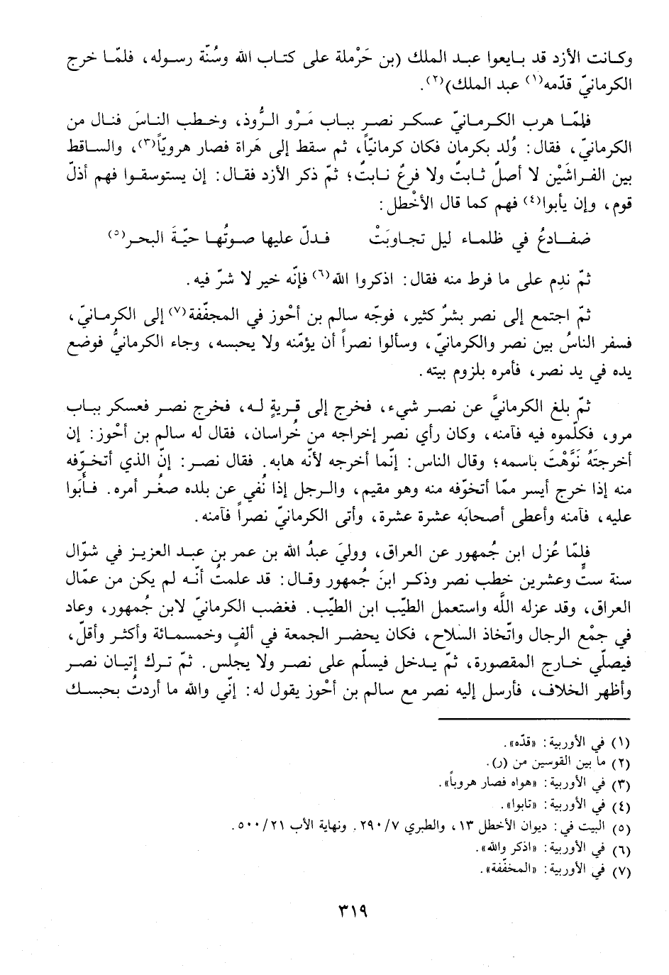 ثُمَّ بَلَغَ الْكَرْمَانِيَّ عَنْ نَصْرٍ شَيْءٌ فَخَرَجَ إِلَى قَرْيَةٍ لَهُ، فَخَرَجَ نَصْرٌ فَعَسْكَرَ بِبَابِ مَرْوَ، فَكَلَّمُوهُ فِيهِ فَآمَنَهُ، وَكَانَ رَأْيُ نَصْرٍ إِخْرَاجَهُ مِنْ خُرَاسَانَ، فَقَالَ لَهُ سَالِمُ بْنُ أَحْوَزَ: إِنْ أَخْرَجْتَهُ نَوَّهْتَ بِاسْمِهِ، وَقَالَ النَّاسُ: إِنَّمَا أَخْرَجَهُ لِأَنَّهُ هَابَهُ. فَقَالَ نَصْرٌ: إِنَّ الَّذِي أَتَخَوَّفُهُ مِنْهُ إِذَا خَرَجَ أَيْسَرُ مِمَّا أَتَخَوَّفُهُ مِنْهُ وَهُوَ مُقِيمٌ، وَالرَّجُلُ إِذَا نُفِيَ عَنْ بَلَدِهِ صَغُرَ أَمْرُهُ. فَأَبَوْا عَلَيْهِ، فَآمَنَهُ وَأَعْطَى أَصْحَابَهُ عَشَرَةً عَشَرَةً، وَأَتَى الْكَرْمَانِيُّ نَصْرًا فَآمَنَهُ.