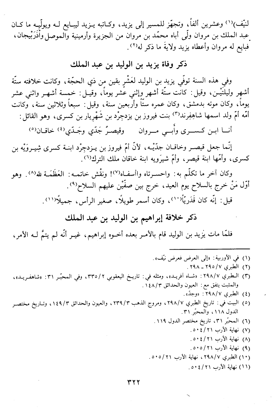 وَفِي هَذِهِ السَّنَةِ تُوُفِّيَ يَزِيدُ بْنُ الْوَلِيدِ لِعَشْرٍ بَقِينَ مِنْ ذِي الْحِجَّةِ، وَكَانَتْ خِلَافَتُهُ سِتَّةَ أَشْهُرٍ وَلَيْلَتَيْنِ، وَقِيلَ: كَانَتْ سِتَّةَ أَشْهُرٍ وَاثْنَيْ عَشَرَ يَوْمًا، وَقِيلَ: خَمْسَةَ أَشْهُرٍ وَاثْنَيْ عَشَرَ يَوْمًا، وَكَانَ مَوْتُهُ بِدِمَشْقَ، وَكَانَ عُمْرُهُ سِتًّا وَأَرْبَعِينَ سَنَةً، وَقِيلَ: سَبْعًا وَثَلَاثِينَ سَنَةً، وَكَانَتْ أُمُّهُ أُمَّ وَلَدٍ اسْمُهَا شَاهْفِرْنَدُ بِنْتُ فَيْرُوزَ بْنِ يَزْدَجِرْدَ بْنِ شَهْرَيَارَ بْنِ كِسْرَى، وَهُوَ الْقَائِلُ: