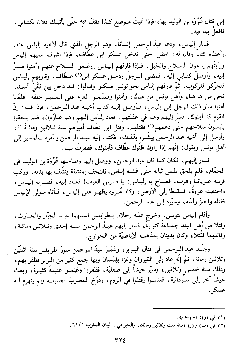 وَأَقَامَ إِلْيَاسُ بِتُونِسَ، وَخَرَجَ عَلَيْهِ رَجُلَانِ بِطَرَابُلُسَ اسْمُهُمَا عَبْدُ الْجَبَّارِ وَالْحَارِثُ وَقَتَلَا مِنْ أَهْلِ الْبَلَدِ جَمَاعَةً كَثِيرَةً، فَسَارَ إِلَيْهِمْ عَبْدُ الرَّحْمَنِ سَنَةَ إِحْدَى وَثَلَاثِينَ وَمِائَةٍ وَقَاتَلَهُمَا فَقُتِلَا، وَكَانَا يَدِينَانِ بِمَذْهَبِ الْإِبَاضِيَّةِ مِنَ الْخَوَارِجِ.