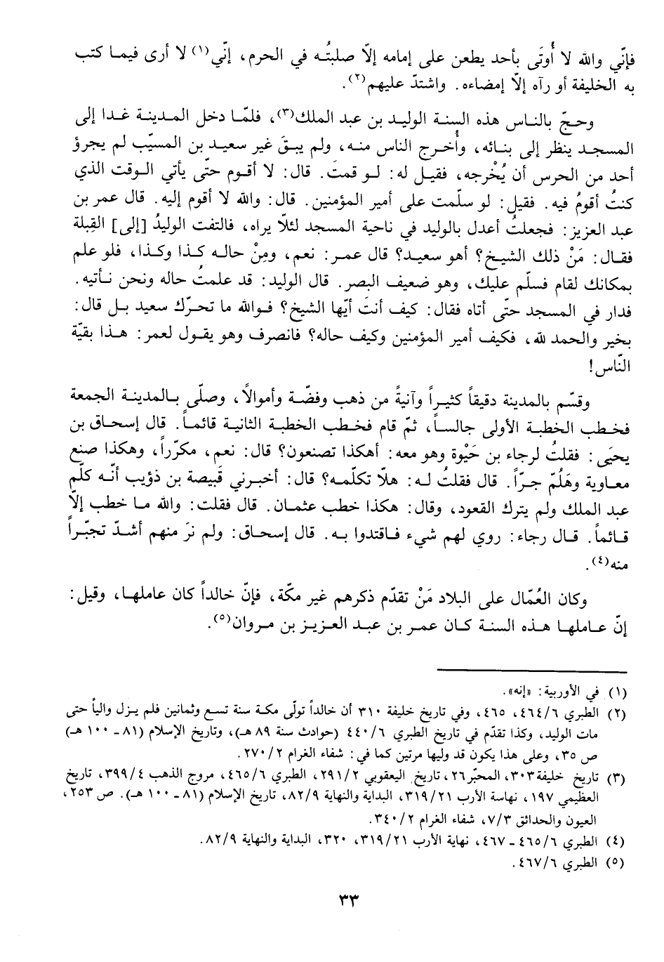 وَحَجَّ بِالنَّاسِ فِي هَذِهِ السَّنَةِ الْوَلِيدُ بْنُ عَبْدِ الْمَلِكِ، فَلَمَّا دَخَلَ الْمَدِينَةَ غَدَا إِلَى الْمَسْجِدِ يَنْظُرُ إِلَى بِنَائِهِ، وَأَخْرَجَ النَّاسَ مِنْهُ، وَلَمْ يَبْقَ غَيْرُ سَعِيدِ بْنِ الْمُسَيَّبِ لَمْ يَجْرُؤْ أَحَدٌ مِنَ الْحَرَسِ أَنْ يُخْرِجَهُ، فَقِيلَ لَهُ: لَوْ قُمْتَ. قَالَ: لَا أَقُومُ حَتَّى يَأْتِيَ الْوَقْتُ الَّذِي كُنْتُ أَقُومُ فِيهِ. فَقِيلَ: لَوْ سَلَّمْتَ عَلَى أَمِيرِ الْمُؤْمِنِينَ. قَالَ: وَاللَّهِ لَا أَقُومُ إِلَيْهِ. قَالَ عُمَرُ بْنُ عَبْدِ الْعَزِيزِ: فَجَعَلْتُ أَعْدِلُ بِالْوَلِيدِ فِي نَاحِيَةِ الْمَسْجِدِ لِئَلَّا يَرَاهُ، فَالْتَفَتَ الْوَلِيدُ [إِلَى] الْقِبْلَةِ فَقَالَ: مَنْ ذَلِكَ الشَّيْخُ؟ أَهْوَ سَعِيدٌ؟ قَالَ عُمَرُ: نَعَمْ، وَمِنْ حَالِهِ كَذَا وَكَذَا، فَلَوْ عَلِمَ بِمَكَانِكَ; لَقَامَ فَسَلَّمَ عَلَيْكَ، وَهُوَ ضَعِيفُ الْبَصَرِ. قَالَ الْوَلِيدُ: قَدْ عَلِمْتُ حَالَهُ وَنَحْنُ نَأْتِيهِ. فَدَارَ فِي الْمَسْجِدِ حَتَّى أَتَاهُ فَقَالَ: كَيْفَ أَنْتَ أَيُّهَا الشَّيْخُ؟ فَوَاللَّهِ مَا تَحَرَّكَ سَعِيدٌ بَلْ قَالَ: بِخَيْرٍ وَالْحَمْدُ لِلَّهِ، فَكَيْفَ أَمِيرُ الْمُؤْمِنِينَ وَكَيْفَ حَالُهُ؟ فَانْصَرَفَ وَهُوَ يَقُولُ لِعُمَرَ: هَذَا بَقِيَّةُ النَّاسِ!