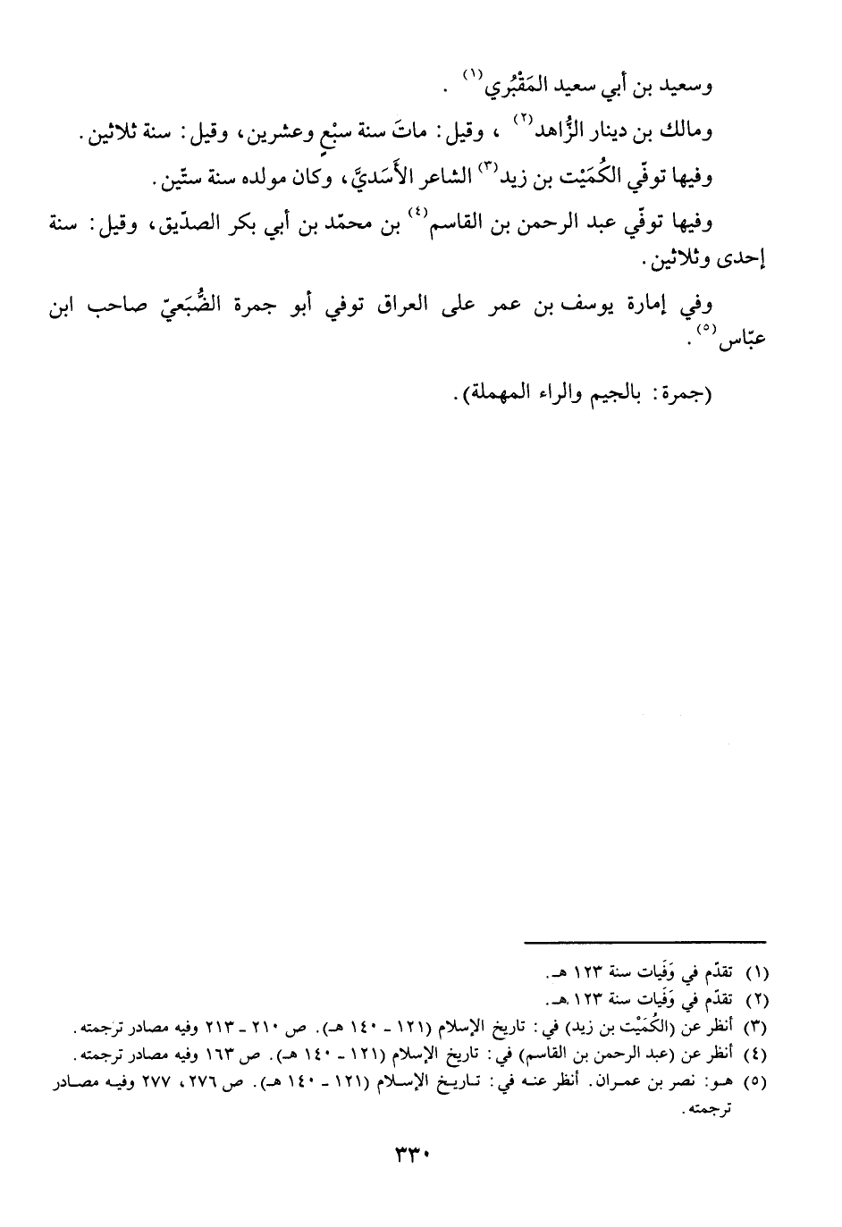 وَسَعِيدُ بْنُ أَبِي سَعِيدٍ الْمَقْبُرِيُّ. وَمَالِكُ بْنُ دِينَارٍ الزَّاهِدُ، وَقِيلَ مَاتَ سَنَةَ سَبْعٍ وَعِشْرِينَ، وَقِيلَ سَنَةَ ثَلَاثِينَ. وَفِيهَا تُوُفِّيَ الْكُمَيْتُ بْنُ زَيْدٍ الشَّاعِرُ الْأَسَدِيُّ، وَكَانَ مَوْلِدُهُ سَنَةَ سِتِّينَ. وَفِيهَا تُوُفِّيَ عَبْدُ الرَّحْمَنِ بْنُ الْقَاسِمِ بْنِ مُحَمَّدِ بْنِ أَبِي بَكْرٍ الصِّدِّيقِ، وَقِيلَ سَنَةَ إِحْدَى وَثَلَاثِينَ. وَفِي إِمَارَةِ يُوسُفَ بْنِ عُمَرَ عَلَى الْعِرَاقِ تُوُفِّيَ أَبُو جَمْرَةَ الضُّبَعِيُّ صَاحِبُ ابْنِ عَبَّاسٍ.