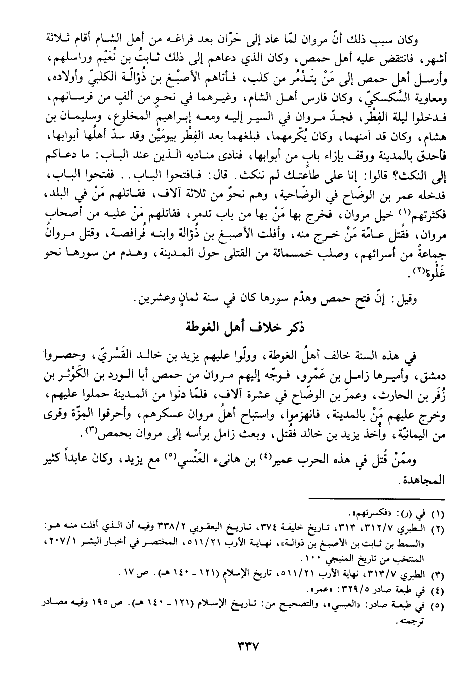 وَكَانَ سَبَبُ ذَلِكَ أَنَّ مَرْوَانَ لَمَّا عَادَ إِلَى حَرَّانَ بَعْدَ فَرَاغِهِ مِنْ أَهْلِ الشَّامِ أَقَامَ ثَلَاثَةَ أَشْهُرٍ، فَانْتَقَضَ عَلَيْهِ أَهْلُ حِمْصَ، وَكَانَ الَّذِي دَعَاهُمْ إِلَى ذَلِكَ ثَابِتُ بْنُ نُعَيْمٍ وَرَاسَلَهُمْ، وَأَرْسَلَ أَهْلُ حِمْصَ إِلَى مَنْ بِتَدْمُرَ مِنْ كَلْبٍ، فَأَتَاهُمُ الْأَصْبَغُ بْنُ ذُؤَالَةَ الْكَلْبِيُّ وَأَوْلَادُهُ وَمُعَاوِيَةُ السَّكْسَكِيُّ، وَكَانَ فَارِسَ أَهْلِ الشَّامِ، وَغَيْرُهُمَا فِي نَحْوٍ مِنْ أَلْفٍ مِنْ فُرْسَانِهِمْ، فَدَخَلُوا لَيْلَةَ الْفِطْرِ، فَجَدَّ مَرْوَانُ فِي السَّيْرِ إِلَيْهِ وَمَعَهُ إِبْرَاهِيمُ الْمَخْلُوعُ وَسُلَيْمَانُ بْنُ هِشَامٍ، وَكَانَ قَدْ آمَنَهُمَا، وَكَانَ يُكْرِمُهُمَا، فَبَلَغَهُمَا بَعْدَ الْفِطْرِ بِيَوْمَيْنِ وَقَدْ سَدَّ أَهْلُهَا أَبْوَابَهَا، فَأَحْدَقَ بِالْمَدِينَةِ وَوَقَفَ بِإِزَاءِ بَابٍ مِنْ أَبْوَابِهَا، فَنَادَى مُنَادِيهِ الَّذِينَ عِنْدَ الْبَابِ: مَا دَعَاكُمْ إِلَى النَّكْثِ؟ قَالُوا: إِنَّا عَلَى طَاعَتِكَ لَمْ نَنْكُثْ. قَالَ: فَافْتَحُوا الْبَابَ، فَفَتَحُوا الْبَابَ، فَدَخَلَهُ عُمَرُ بْنُ الْوَضَّاحِ فِي الْوَضَّاحِيَّةِ، وَهُمْ نَحْوٌ مِنْ ثَلَاثَةِ آلَافٍ، فَقَاتَلَهُمْ مَنْ فِي الْبَلَدِ، فَكَثَّرَتْهُمْ خَيْلُ مَرْوَانَ، فَخَرَجَ بِهَا مَنْ بِهَا مِنْ بَابِ تَدْمُرَ، فَقَاتَلَهُمْ مَنْ عَلَيْهِ مِنْ أَصْحَابِ مَرْوَانَ، فَقَتَلَ عَامَّةَ مَنْ خَرَجَ مِنْهُ، وَأَفْلَتَ الْأَصْبَغُ بْنُ ذُؤَالَةَ وَابْنُهُ فُرَافِصَةُ، وَقَتَلَ مَرْوَانُ جَمَاعَةً مِنْ أُسَرَائِهِمْ، وَصَلَبَ خَمْسَمِائَةٍ مِنَ الْقَتْلَى حَوْلَ الْمَدِينَةِ، وَهَدَمَ مِنْ سُورِهَا نَحْوَ غَلْوَةٍ.
