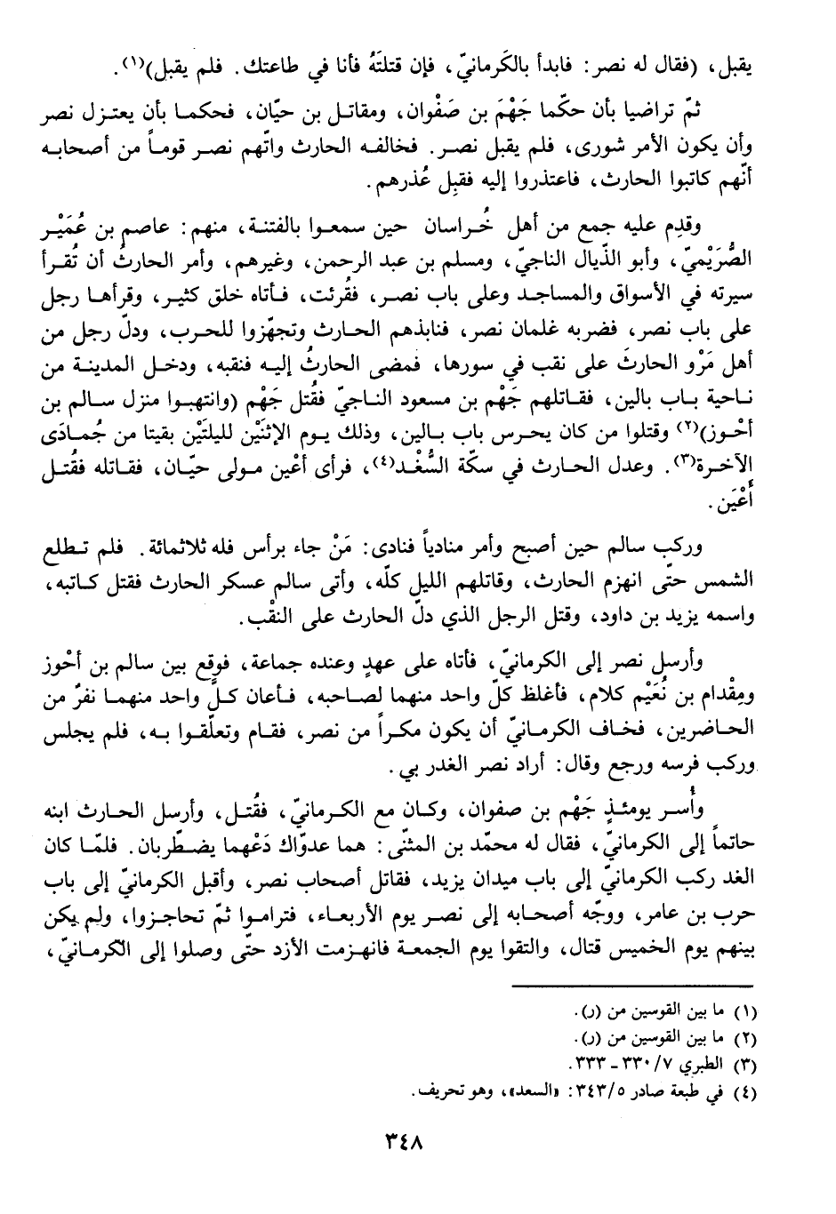 وَأُسِرَ يَوْمَئِذٍ جَهْمُ بْنُ صَفْوَانَ، وَكَانَ مَعَ الْكَرْمَانِيِّ، فَقُتِلَ، وَأَرْسَلَ الْحَارِثُ ابْنَهُ حَاتِمًا إِلَى الْكَرْمَانِيِّ، فَقَالَ لَهُ مُحَمَّدُ بْنُ الْمُثَنَّى: هُمَا عَدُوَّاكَ دَعْهُمَا يَضْطَرِبَانِ. فَلَمَّا كَانَ الْغَدُ رَكِبَ الْكَرْمَانِيُّ إِلَى بَابِ مَيْدَانِ يَزِيدَ فَقَاتَلَ أَصْحَابَ نَصْرٍ، وَأَقْبَلَ الْكَرْمَانِيُّ إِلَى بَابِ حَرْبِ بْنِ عَامِرٍ وَوَجَّهَ أَصْحَابَهُ إِلَى نَصْرٍ يَوْمَ الْأَرْبِعَاءِ فَتَرَامَوْا ثُمَّ تَحَاجَزُوا، وَلَمْ يَكُنْ بَيْنَهُمْ يَوْمَ الْخَمِيسِ قِتَالٌ، وَالْتَقَوْا يَوْمَ الْجُمْعَةِ فَانْهَزَمَتِ الْأَزْدُ حَتَّى وَصَلُوا إِلَى الْكَرْمَانِيِّ،