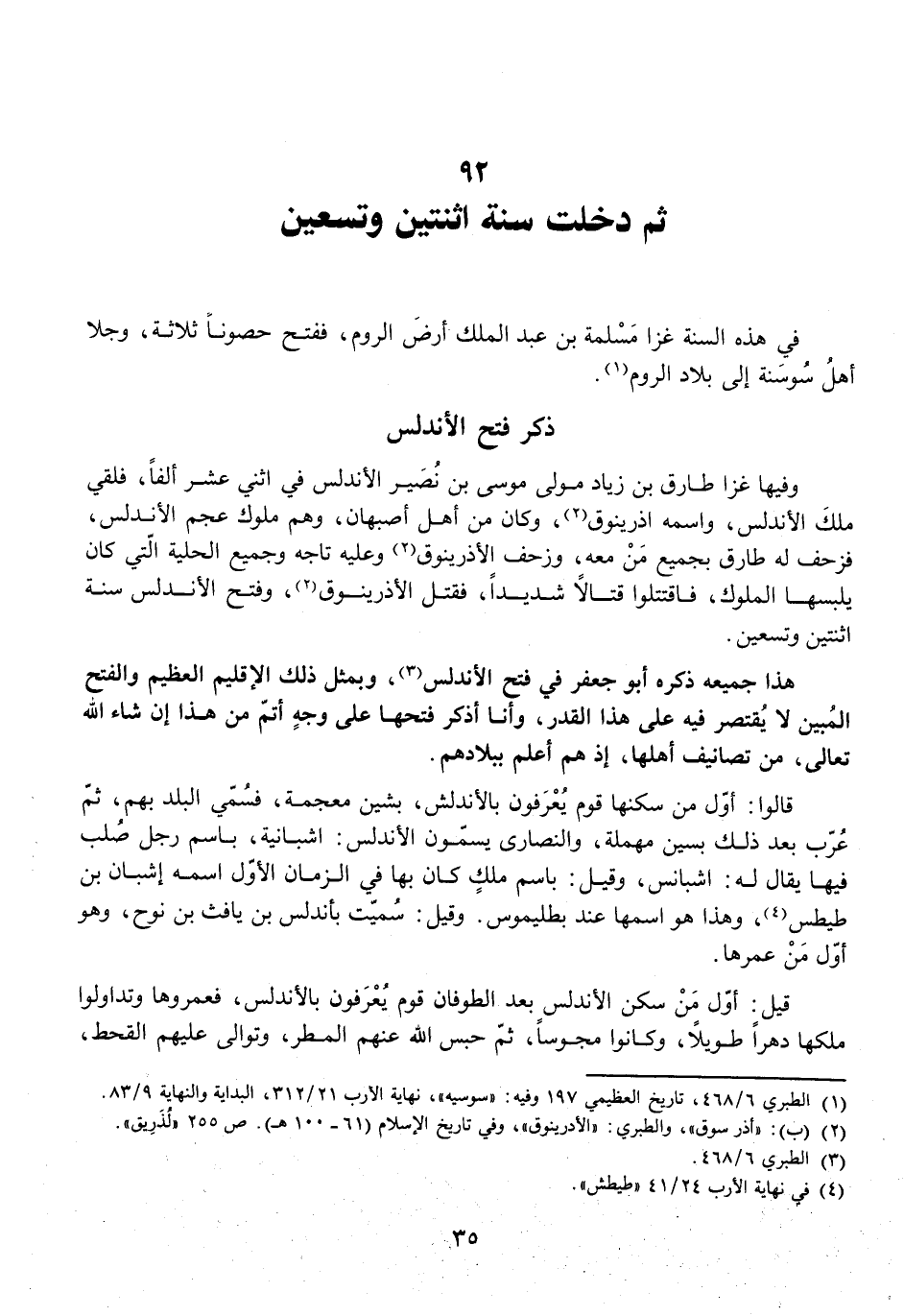 وَفِيهَا غَزَا طَارِقُ بْنُ زِيَادٍ مَوْلَى مُوسَى بْنِ نُصَيْرٍ الْأَنْدَلُسَ فِي اثْنَيْ عَشَرَ أَلْفًا، فِلْقَيْ مَلِكَ الْأَنْدَلُسِ، وَاسْمُهُ أَذْرِينُوقُ، وَكَانَ مِنْ أَهْلِ أَصْبَهَانَ، وَهُمْ مُلُوكِ عَجَمِ الْأَنْدَلُسِ، فَزَحَفَ لَهُ طَارِقٌ بِجَمِيعِ مَنْ مَعَهُ، وَزَحَفَ الْأَذْرِينُوقُ وَعَلَيْهِ تَاجُهُ وَجَمِيعُ الْحِلْيَةِ الَّتِي كَانَ يَلْبَسُهَا الْمُلُوكُ، فَاقْتَتَلُوا قِتَالًا شَدِيدًا، فَقُتِلَ الْأَذْرِينُوقُ، وَفُتِحَ الْأَنْدَلُسُ سَنَةَ اثْنَتَيْنِ وَتِسْعِينَ.