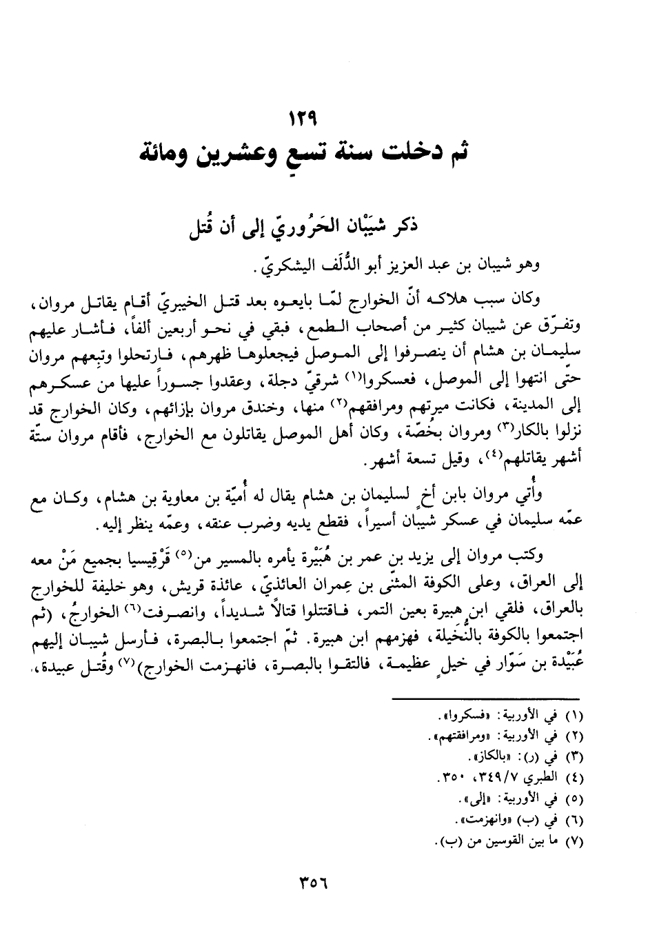 وَكَتَبَ مَرْوَانُ إِلَى يَزِيدَ بْنِ عُمَرَ بْنِ هُبَيْرَةَ يَأْمُرُهُ بِالْمَسِيرِ مِنْ قَرْقِيسِيَا بِجَمِيعِ مَنْ مَعَهُ إِلَى الْعِرَاقِ، وَعَلَى الْكُوفَةِ الْمُثَنَّى بْنُ عِمْرَانَ الْعَائِذِيُّ، عَائِذَةُ قُرَيْشٍ، وَهُوَ خَلِيفَةٌ لِلْخَوَارِجِ بِالْعِرَاقِ، فَلَقِيَ ابْنَ هُبَيْرَةَ بِعَيْنِ التَّمْرِ، فَاقْتَتَلُوا قِتَالًا شَدِيدًا، وَانْصَرَفَتِ الْخَوَارِجُ (ثُمَّ اجْتَمَعُوا بِالْكُوفَةِ بِالنَّخِيلَةِ، فَهَزَمَهُمُ ابْنُ هُبَيْرَةَ. ثُمَّ اجْتَمَعُوا بِالْبَصْرَةِ، فَأَرْسَلَ شَيْبَانُ إِلَيْهِمْ عُبَيْدَةَ بْنَ سَوَّارٍ فِي خَيْلٍ عَظِيمَةٍ، فَالْتَقَوْا بِالْبَصْرَةِ، فَانْهَزَمَتِ الْخَوَارِجُ) وَقُتِلَ عُبَيْدَةُ،