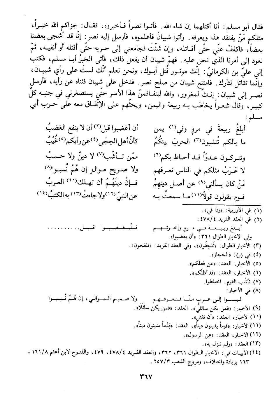 فَقَالَ أَبُو مُسْلِمٍ: أَنَا أَقْتُلُهُمَا إِنْ شَاءَ اللَّهُ. فَأَتَوْا نَصْرًا فَأَخْبَرُوهُ، فَقَالَ: جَزَاكُمُ اللَّهُ خَيْرًا، مِثْلُكُمْ مَنْ يَفْتَقِدُ هَذَا وَيَعْرِفُهُ. وَأَتَوْا شَيْبَانَ فَأَعْلَمُوهُ فَأَرْسَلَ إِلَيْهِ نَصْرٌ: إِنَّا قَدْ أَشْجَى بَعْضُنَا بَعْضًا، فَاكْفُفْ عَنِّي حَتَّى أُقَاتِلَهُ، وَإِنْ شِئْتَ فَجَامِعْنِي إِلَى حَرْبِهِ حَتَّى أَقْتُلَهُ أَوْ أَنْفِيَهُ ثُمَّ نَعُودُ إِلَى أَمْرِنَا الَّذِي نَحْنُ عَلَيْهِ. فَهَمَّ شَيْبَانُ أَنْ يَفْعَلَ ذَلِكَ، فَأَتَى الْخَبَرُ أَبَا مُسْلِمٍ، فَكَتَبَ إِلَى عَلِيِّ بْنِ الْكَرْمَانِيِّ: إِنَّكَ مَوْتُورٌ قُتِلَ أَبُوكَ، وَنَحْنُ نَعْلَمُ أَنَّكَ لَسْتَ عَلَى رَأْيِ شَيْبَانَ، وَإِنَّمَا تُقَاتِلُ لِثَأْرِكَ. فَامْتَنَعَ شَيْبَانُ مِنْ صُلْحِ نَصْرٍ. فَدَخَلَ عَلَى شَيْبَانَ فَثَنَاهُ عَنْ رَأْيِهِ، فَأَرْسَلَ نَصْرٌ إِلَى شَيْبَانَ: إِنَّكَ لَمَغْرُورٌ، وَاللَّهِ لَيَتَفَاقَمَنَّ هَذَا الْأَمْرُ حَتَّى يَسْتَصْغِرَنِي فِي جَنْبِهِ كُلُّ كَبِيرٍ، وَقَالَ شِعْرًا يُخَاطِبُ بِهِ رَبِيعَةَ وَالْيَمَنَ وَيَحُثُّهُمْ عَلَى الِاتِّفَاقِ مَعَهُ عَلَى حَرْبِ أَبِي مُسْلِمٍ:
