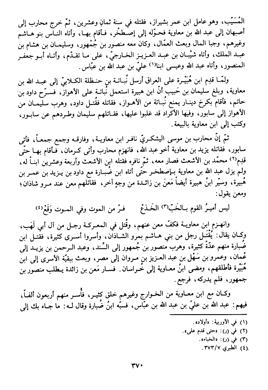 الْمُسَيَّبِ، وَهُوَ عَامِلُ ابْنِ عُمَرَ بِشِيرَازَ، فَقَتَلَهُ فِي سَنَةِ ثَمَانٍ وَعِشْرِينَ، ثُمَّ خَرَجَ مُحَارِبٌ إِلَى أَصْبَهَانَ إِلَى عَبْدِ اللَّهِ بْنِ مُعَاوِيَةَ فَحَوَّلَهُ إِلَى إِصْطَخْرَ، فَأَقَامَ بِهَا، وَأَتَاهُ النَّاسُ بَنُو هَاشِمٍ وَغَيْرُهُمْ، وَجَبَا الْمَالَ وَبَعَثَ الْعُمَّالَ، وَكَانَ مَعَهُ مَنْصُورُ بْنُ جُمْهُورٍ وَسُلَيْمَانُ بْنُ هِشَامِ بْنِ عَبْدِ الْمَلِكِ، وَأَتَاهُ شَيْبَانُ بْنُ عَبْدِ الْعَزِيزِ الْخَارِجِيُّ، عَلَى مَا تَقَدَّمَ، وَأَتَاهُ أَبُو جَعْفَرٍ الْمَنْصُورُ، وَأَتَاهُ عَبْدُ اللَّهِ وَعِيسَى ابْنَا عَلِيِّ بْنِ عَبْدِ اللَّهِ بْنِ عَبَّاسٍ.