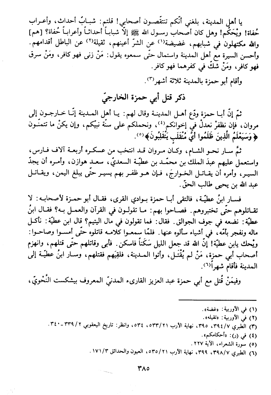 ثُمَّ إِنَّ أَبَا حَمْزَةَ وَدَّعَ أَهْلَ الْمَدِينَةِ وَقَالَ لَهُمْ: يَا أَهْلَ الْمَدِينَةِ إِنَّا خَارِجُونَ إِلَى مَرْوَانَ، فَإِنْ نَظْفَرْ نَعْدِلْ فِي إِخْوَانِكُمْ وَنَحْمِلْكُمْ عَلَى سُنَّةِ نَبِيِّكُمْ، وَإِنْ يَكُنْ مَا تَتَمَنَّوْنَ، {وَسَيَعْلَمُ الَّذِينَ ظَلَمُوا أَيَّ مُنْقَلَبٍ يَنْقَلِبُونَ} [الشعراء: 227] .