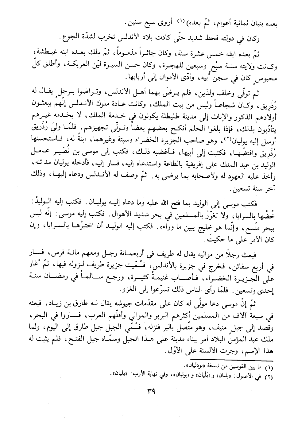 ثُمَّ إِنَّ مُوسَى دَعَا مَوْلًى لَهُ كَانَ عَلَى مُقَدِّمَاتِ جُيُوشِهِ يُقَالُ لَهُ طَارِقُ بْنُ زِيَادٍ، فَبَعَثَهُ فِي سَبْعَةِ آلَافٍ مِنَ الْمُسْلِمِينَ أَكْثَرُهُمُ الْبَرْبَرُ وَالْمُوَالِي وَأَقَلُّهُمُ الْعَرَبُ، فَسَارُوا فِي الْبَحْرِ، وَقَصَدَ إِلَى جَبَلٍ مُنِيفٍ، وَهُوَ مُتَّصِلٌ بِالْبَرِّ فَنَزَلَهُ، فَسُمِّيَ الْجَبَلُ جَبَلَ طَارِقٍ إِلَى الْيَوْمِ، وَلَمَّا مَلَكَ عَبْدُ الْمُؤْمِنِ الْبِلَادَ أَمَرَ بِبِنَاءِ مَدِينَةٍ عَلَى هَذَا الْجَبَلِ وَسَمَّاهُ جَبَلَ الْفَتْحِ، فَلَمْ يَثْبُتْ لَهُ هَذَا الِاسْمُ وَجَرَتِ الْأَلْسِنَةُ عَلَى الْأَوَّلِ.