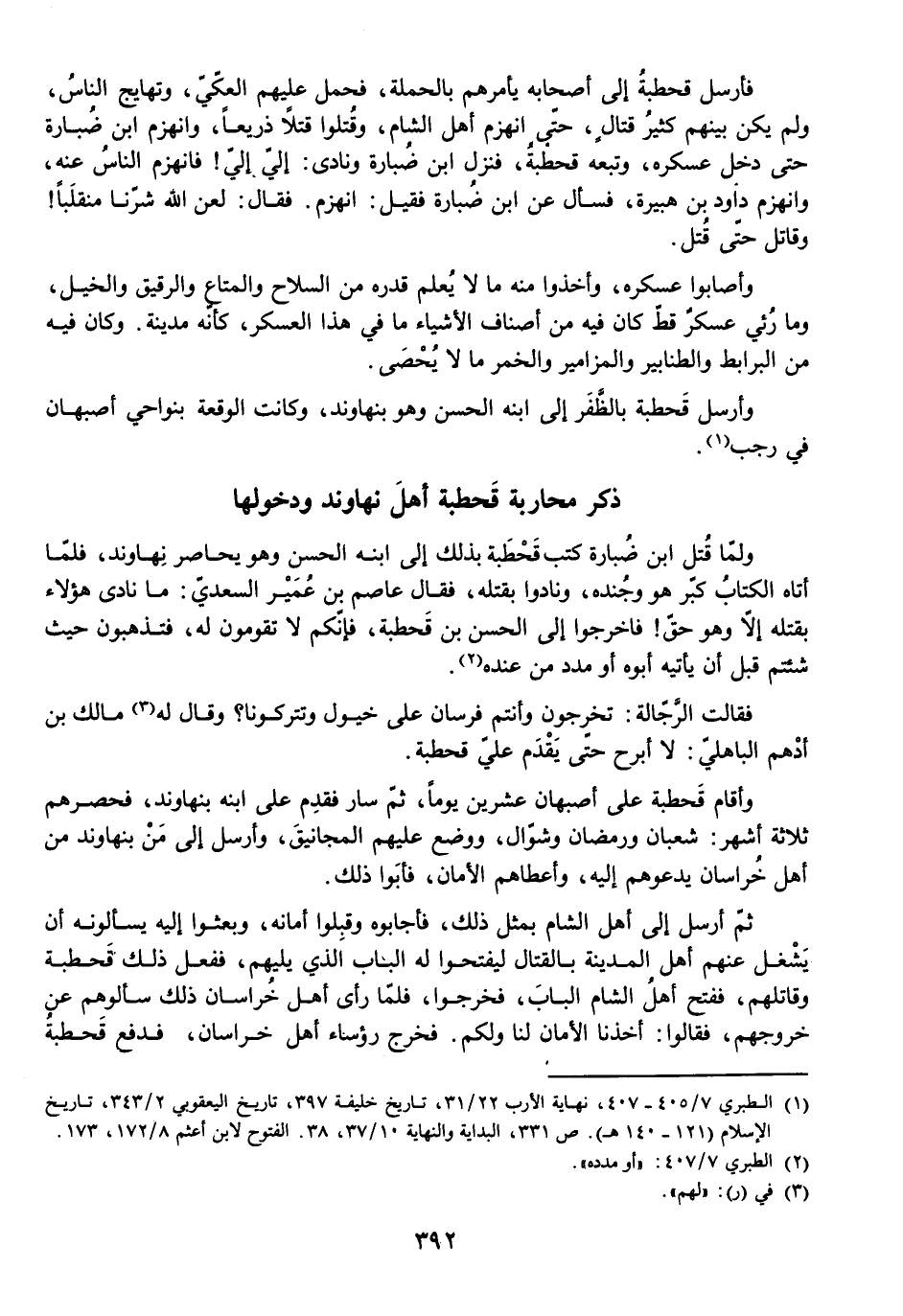 وَأَقَامَ قَحْطَبَةُ عَلَى أَصْبَهَانَ عِشْرِينَ يَوْمًا، ثُمَّ سَارَ فَقَدِمَ عَلَى ابْنِهِ بِنَهَاوَنْدَ فَحَصَرَهُمْ ثَلَاثَةَ أَشْهُرٍ: شَعْبَانُ وَرَمَضَانُ وَشَوَّالٌ، وَوَضَعَ عَلَيْهِمُ الْمَجَانِيقَ، وَأَرْسَلَ إِلَى مَنْ بِنَهَاوَنْدَ مِنْ أَهْلِ خُرَاسَانَ يَدْعُوهُمْ إِلَيْهِ وَأَعْطَاهُمُ الْأَمَانَ، فَأَبَوْا ذَلِكَ.