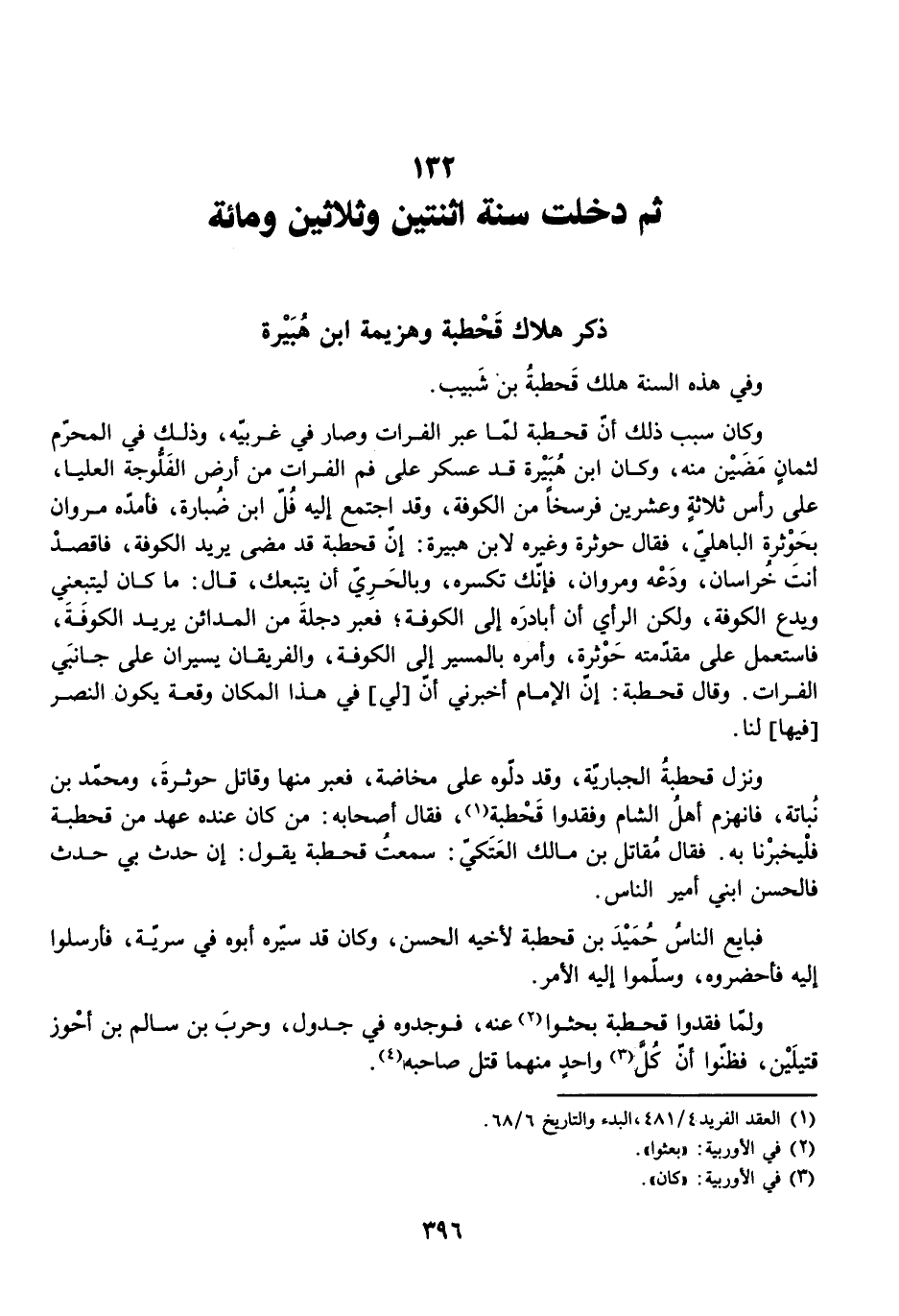 ثُمَّ دَخَلَتْ سَنَةُ اثْنَتَيْنِ وَثَلَاثِينَ وَمِائَةٍ ذِكْرُ هَلَاكِ قَحْطَبَةَ وَهَزِيمَةِ ابْنِ هُبَيْرَةَ
