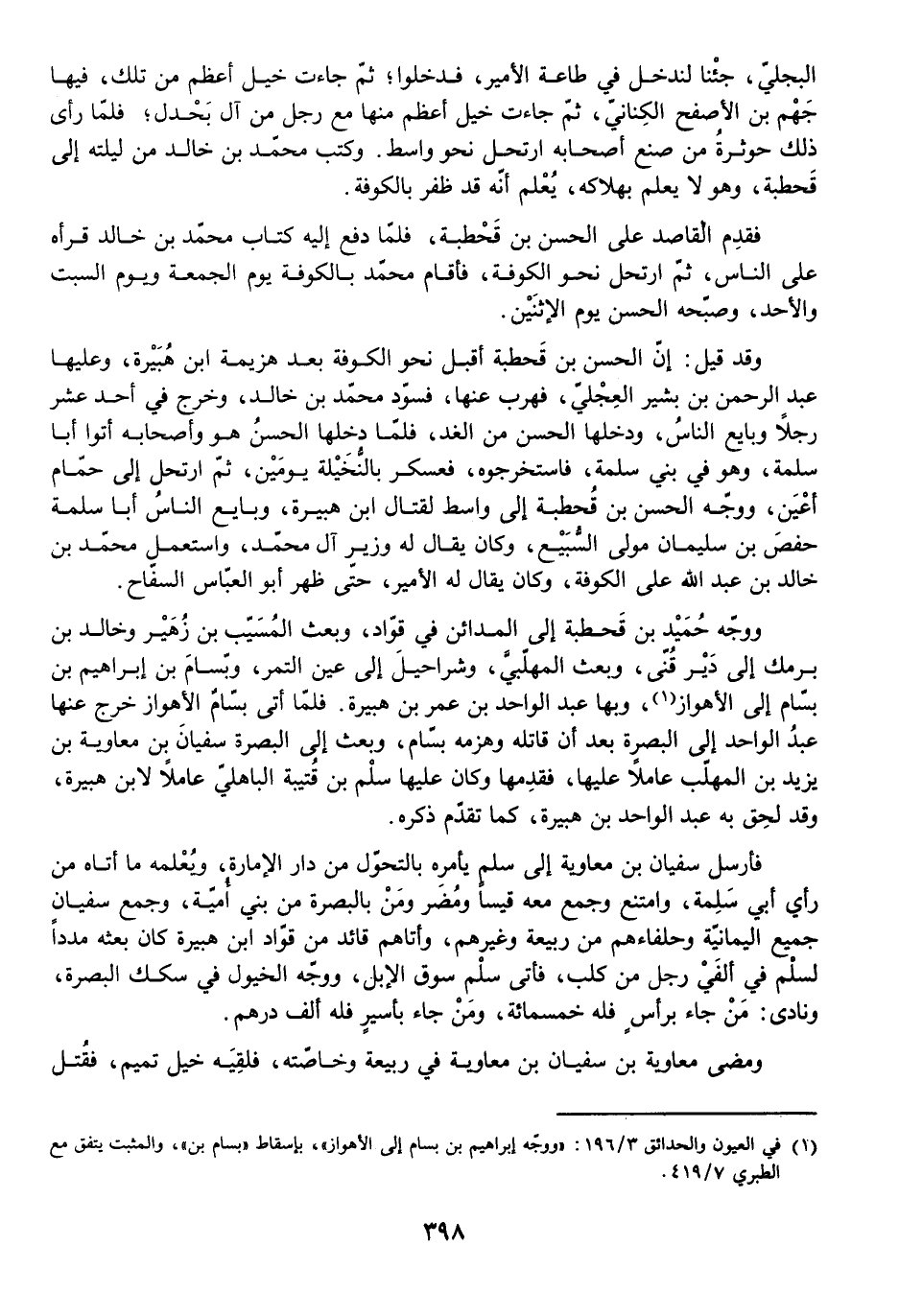 وَوَجَّهَ حُمَيْدَ بْنَ قَحْطَبَةَ إِلَى الْمَدَائِنِ فِي قُوَّادٍ، وَبَعَثَ الْمُسَيَّبَ بْنَ زُهَيْرٍ وَخَالِدَ بْنَ بَرْمَكَ إِلَى دَيْرِ قُنَّى، وَبَعَثَ الْمُهَلَّبِيَّ وَشَرَاحِيلَ إِلَى عَيْنِ التَّمْرِ، وَبَسَّامَ بْنَ إِبْرَاهِيمَ بْنِ بَسَّامٍ إِلَى الْأَهْوَازِ، وَبِهَا عَبْدُ الْوَاحِدِ بْنُ عُمَرَ بْنِ هُبَيْرَةَ. فَلَمَّا أَتَى بَسَّامٌ الْأَهْوَازَ خَرَجَ عَنْهَا عَبْدُ الْوَاحِدِ إِلَى الْبَصْرَةِ بَعْدَ أَنْ قَاتَلَهُ وَهَزَمَهُ بَسَّامٌ، وَبَعَثَ إِلَى الْبَصْرَةِ سُفْيَانَ بْنَ مُعَاوِيَةَ بْنِ يَزِيدَ بْنِ الْمُهَلَّبِ عَامِلًا عَلَيْهَا، فَقَدِمَهَا وَكَانَ عَلَيْهَا سَلْمُ بْنُ قُتَيْبَةَ الْبَاهِلِيُّ عَامِلًا لِابْنِ هُبَيْرَةَ، وَقَدْ لَحِقَ بِهِ عَبْدُ الْوَاحِدِ بْنُ هُبَيْرَةَ، كَمَا تَقَدَّمَ ذِكْرُهُ.